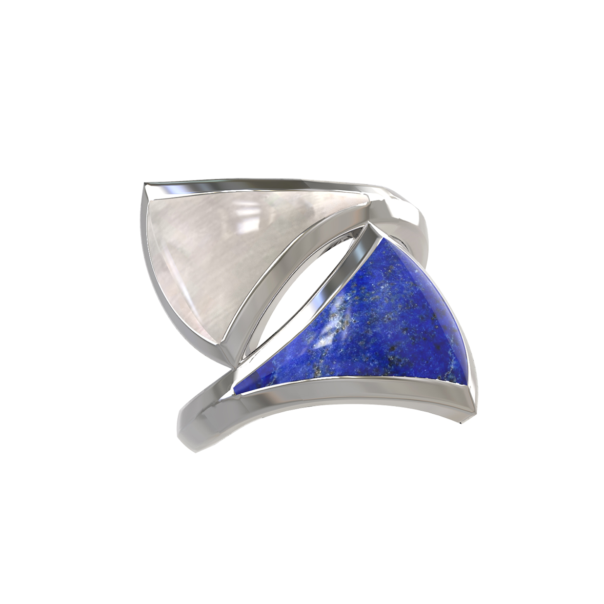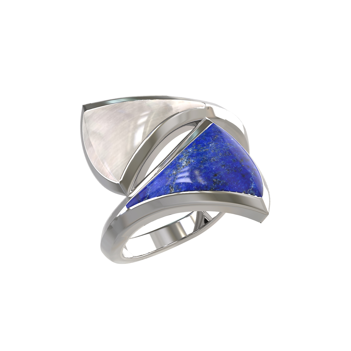Элегантное кольцо из белого золота 585 пробы станет центральным акцентом вашего образа, привлекая внимание необычной формой и контрастным сочетанием материалов. Дизайн изделия вдохновлен грациозным силуэтом веера, что придает украшению особую динамику и изысканность. Мастера ювелирного дела объединили в одной композиции благородный холодный блеск драгоценного металла с глубиной синего лазурита и нежным сиянием перламутра. Комбинация этих двух вставок создает уникальную игру света и текстур, делая аксессуар по-настоящему запоминающимся.