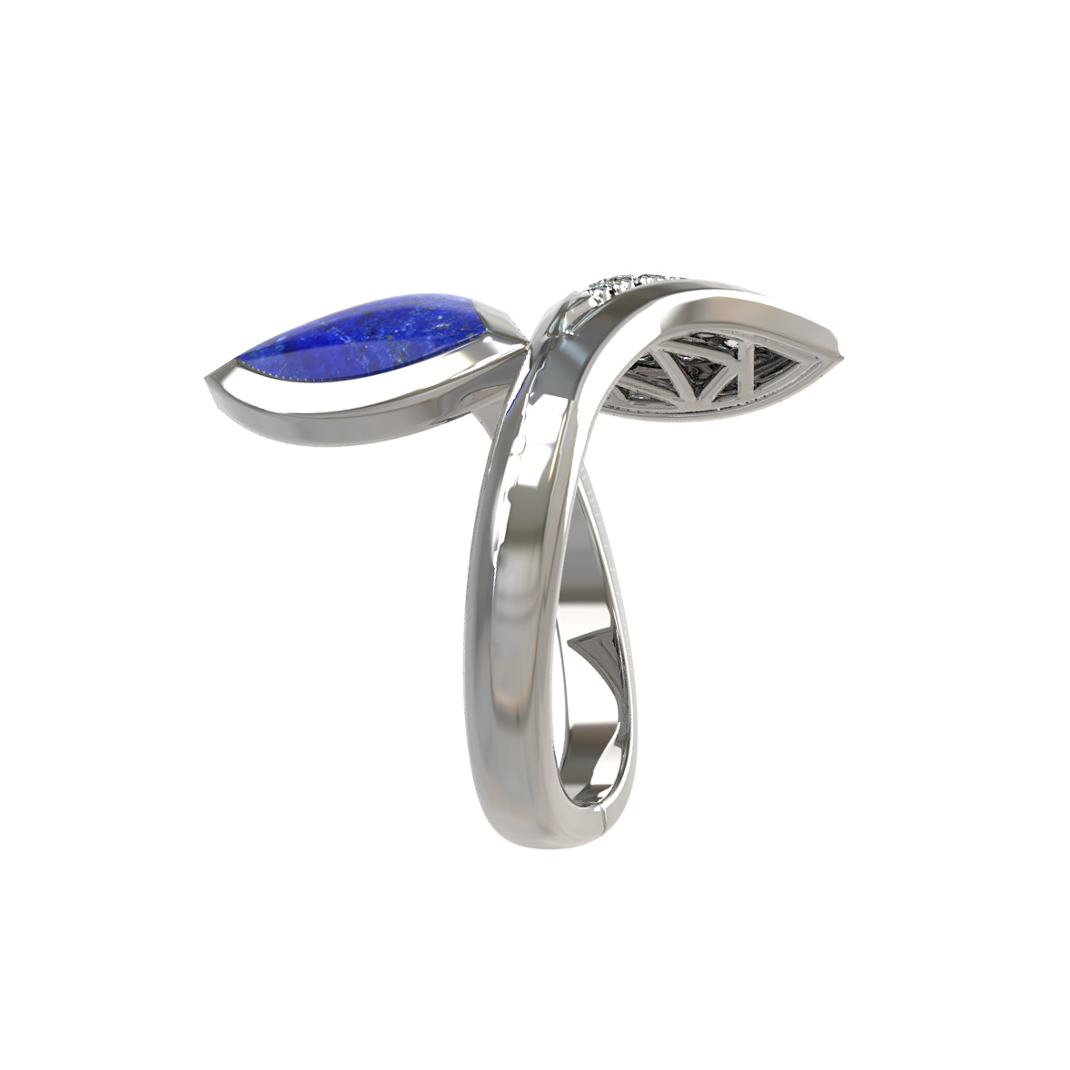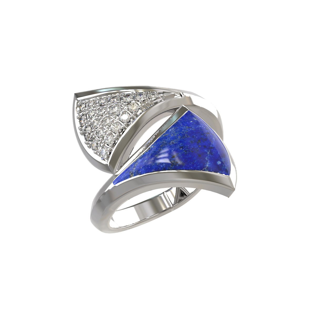 Центральный элемент композиции — сочетание глубокого синего оттенка лазурита и ослепительного сияния вставок. На изделии расположено 22 драгоценных камня круглой формы: прозрачные бриллианты создают яркую игру света, контрастируя с насыщенным цветом лазурита. Холодный оттенок металла идеально дополняет палитру вставок, придавая украшению благородный и завершенный вид.