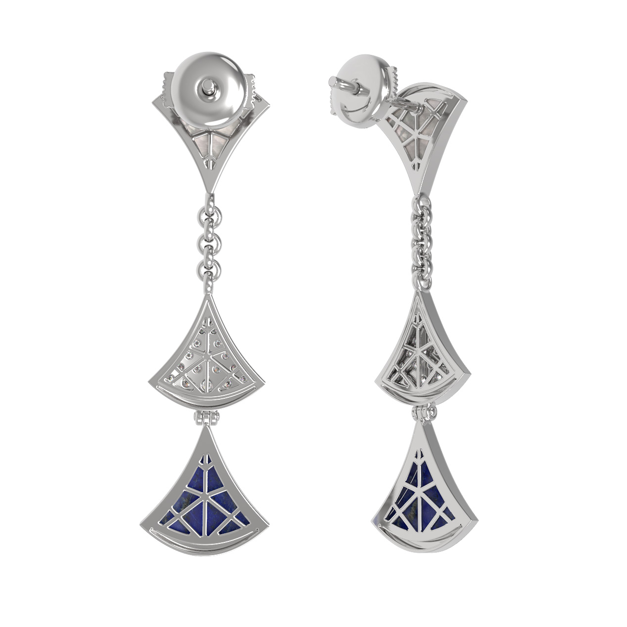 Общее количество вставок составляет 36 штук, что придает изделию особое благородство и блеск при каждом вашем движении. Белое золото подчеркивает чистоту камней и глубину цвета минералов, делая аксессуар универсальным дополнением образа. Серьги из белого золота с бриллиантами, лазуритом и перламутром созданы для тех, кто ценит эстетику и качество в каждой детали.