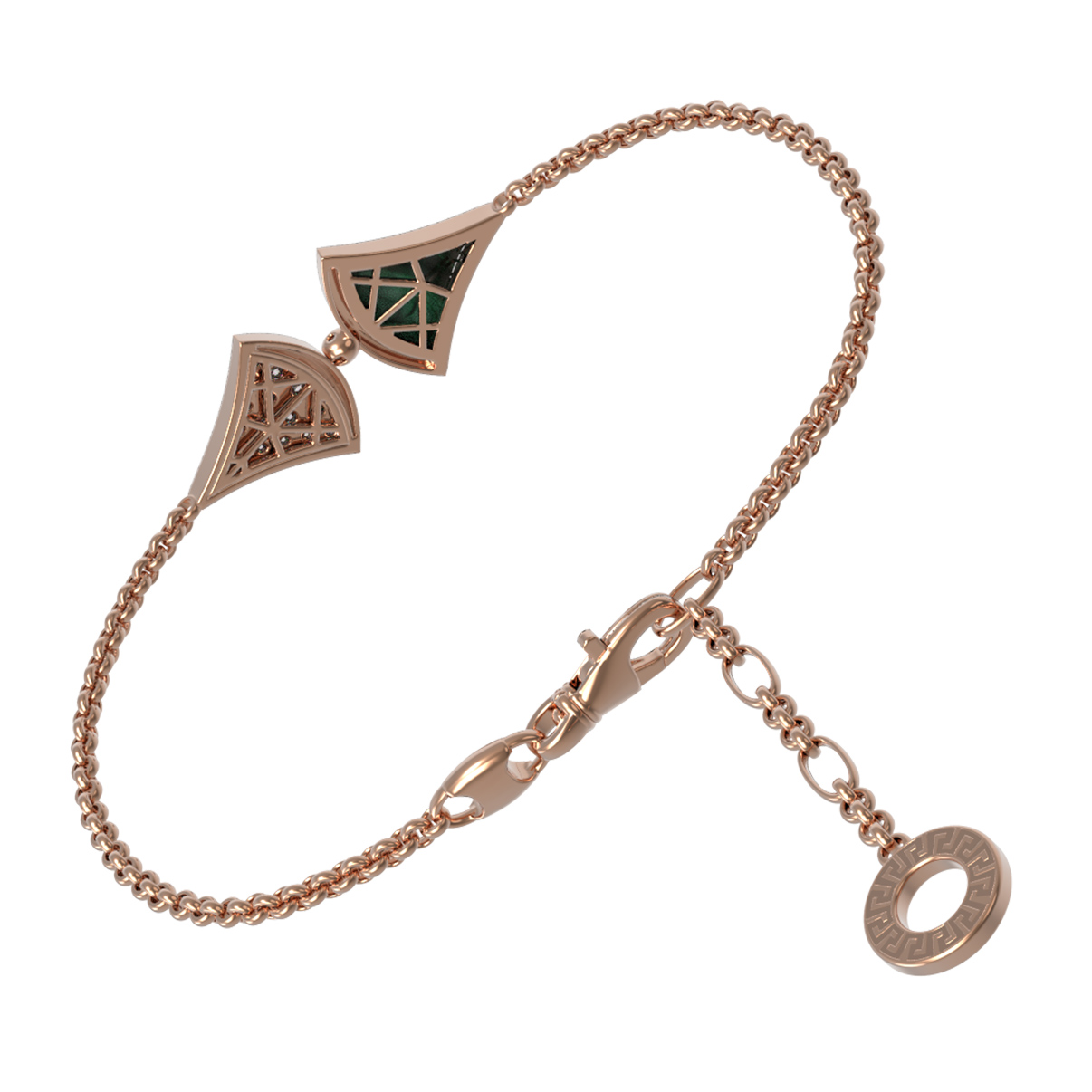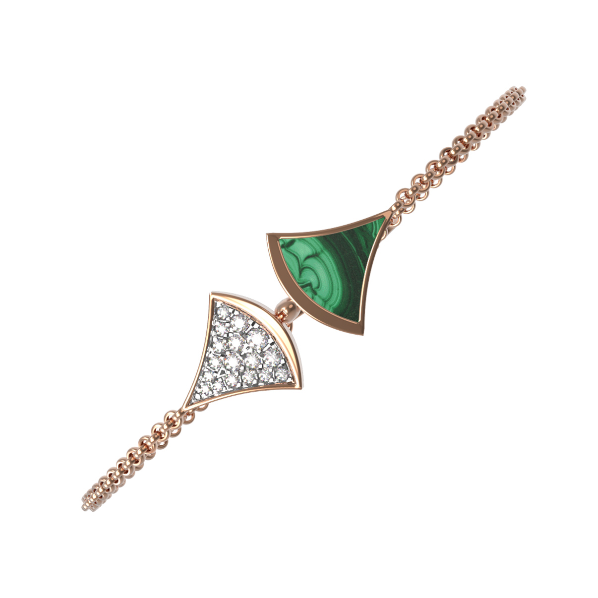 Центральную композицию браслета дополняют 18 вставок круглой формы, создающих гармоничный контраст. Глубокий зеленый оттенок натурального малахита эффектно сочетается с ослепительным блеском белых бриллиантов. Благородный красный цвет золота подчеркивает природную красоту камней и добавляет украшению теплого сияния. Конструкция браслета выполнена с вниманием к деталям, обеспечивая комфорт при ношении и надежную фиксацию на запястье.