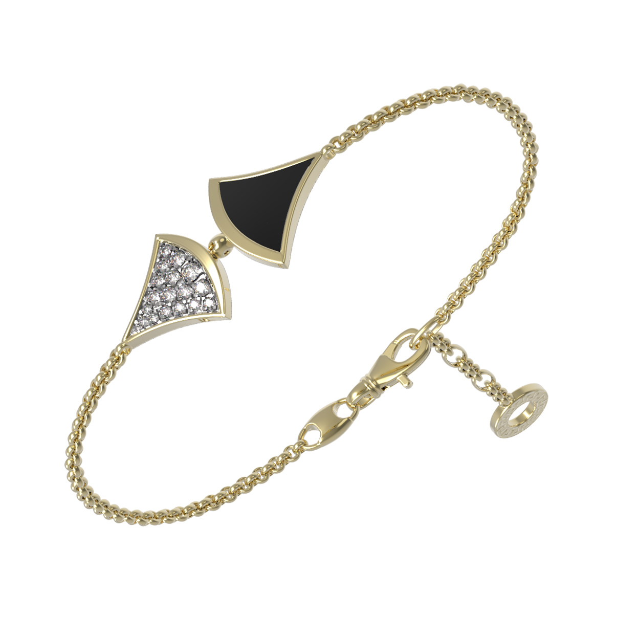 Этот утонченный браслет из лимонного золота 585 пробы — гармоничное сочетание классической роскоши и современного дизайна. Центральным элементом композиции является выразительный дизайн в форме веера, который придает изделию динамику и особый эстетический шарм. В декоре украшения виртуозно обыграно контрастное сочетание цветов: глубокого черного оникса и сверкающих белых бриллиантов. Всего в браслете использовано 18 вставок классической круглой формы, благодаря чему аксессуар выглядит эффектно и притягательно.