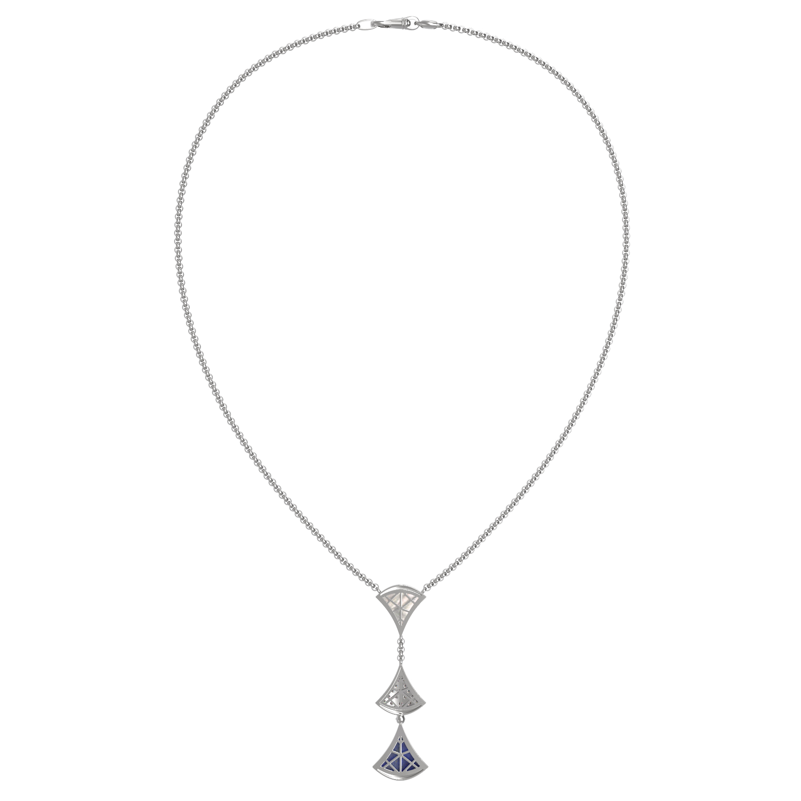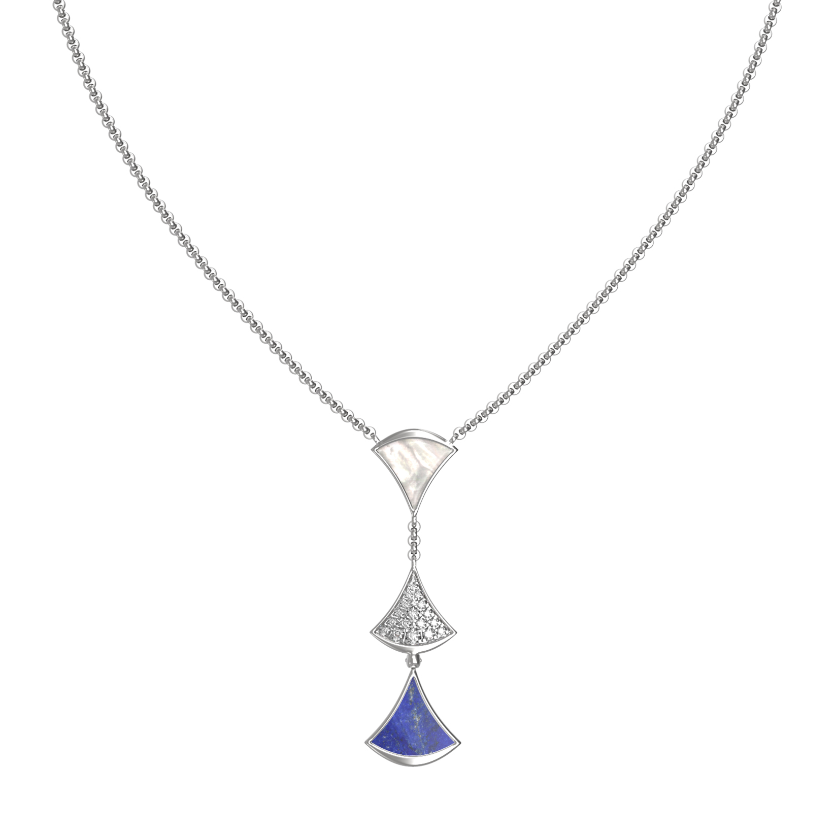 Особую выразительность колье придают 36 вставок круглой формы, которые создают неповторимую игру света и цвета. Россыпь сверкающих бриллиантов соседствует с глубоким, насыщенным синим лазуритом и нежным перламутром, создавая роскошный контраст. Белое золото идеально обрамляет эту композицию, добавляя изделию благородный холодный блеск.