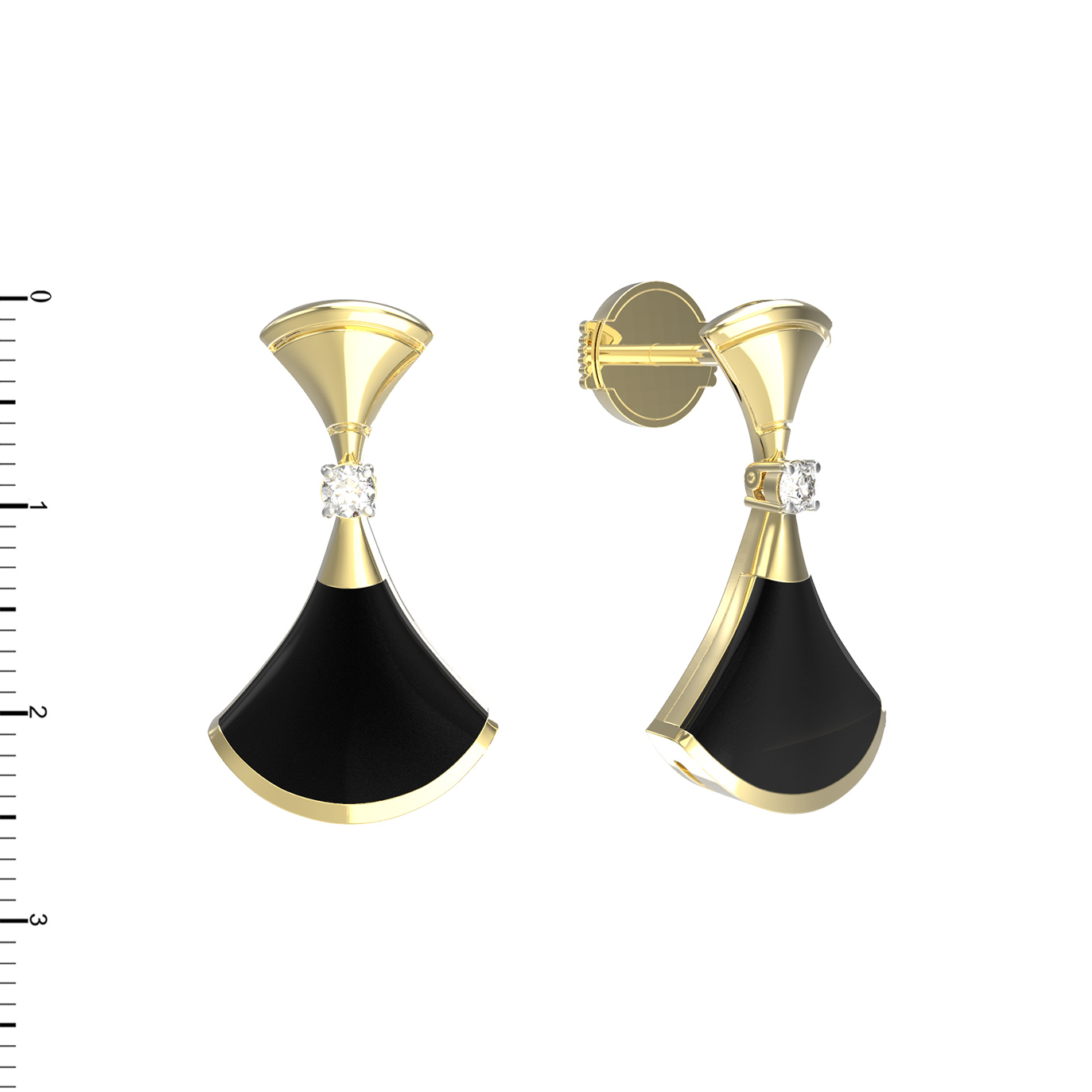 Центральным элементом композиции является искусное сочетание вставок: глубокий черный оникс гармонирует с сияющим белым бриллиантом. Всего в изделии использовано 4 вставки круглой формы, которые создают сбалансированную и притягательную игру света. Гладкие линии золота и насыщенный цвет оникса формируют лаконичный, но эффектный вид, позволяющий этим серьгам стать центром вашего ювелирного гардероба.