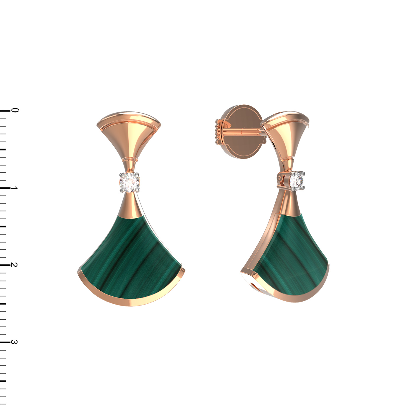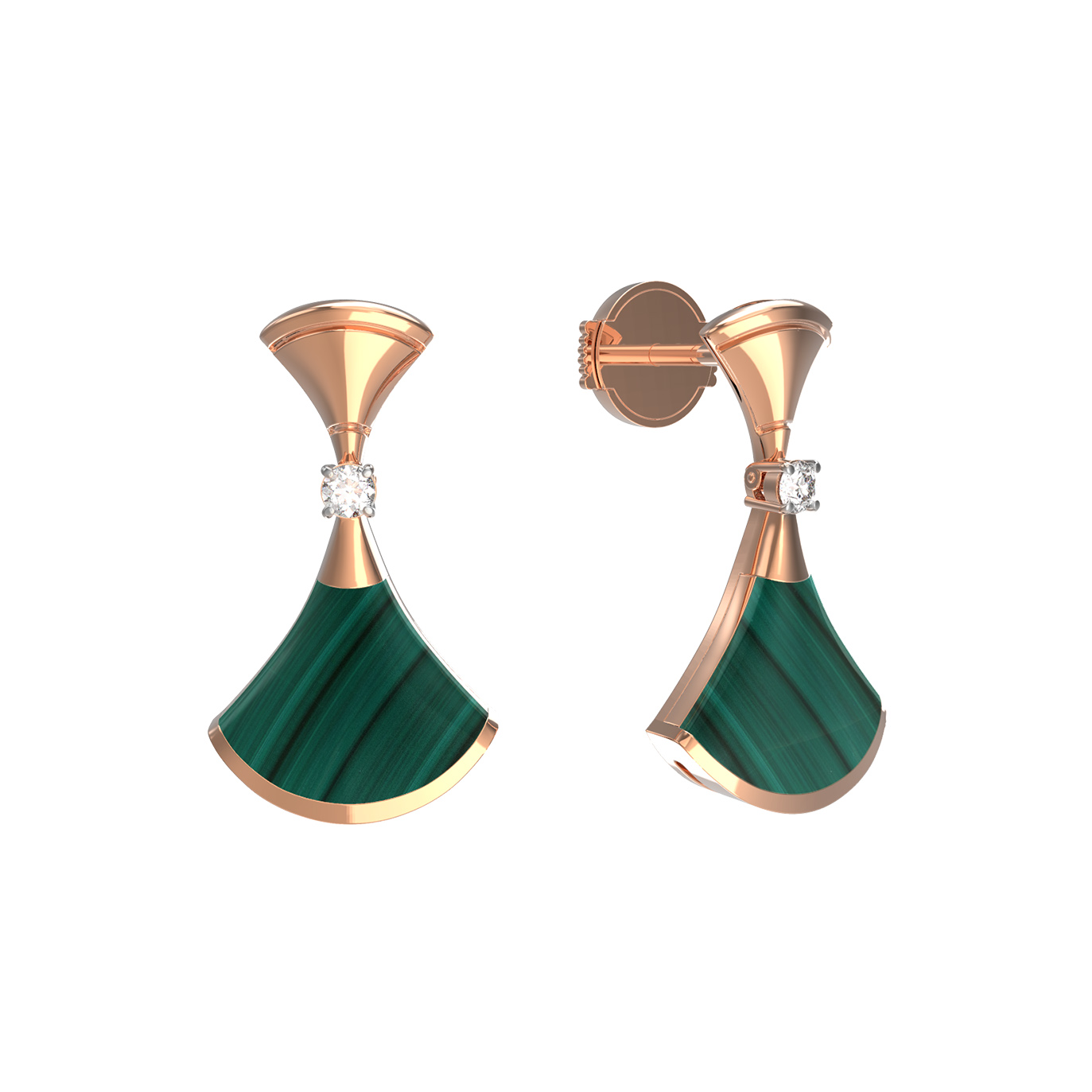 Центральным элементом композиции стали вставки из натурального малахита насыщенного зелёного цвета, которые завораживают своим природным рисунком. В качестве изысканного акцента ювелиры использовали бриллианты белого цвета. Всего в изделии предусмотрено 4 вставки круглой формы, которые мягко переливаются при каждом движении, добавляя украшению блеска и роскоши.
