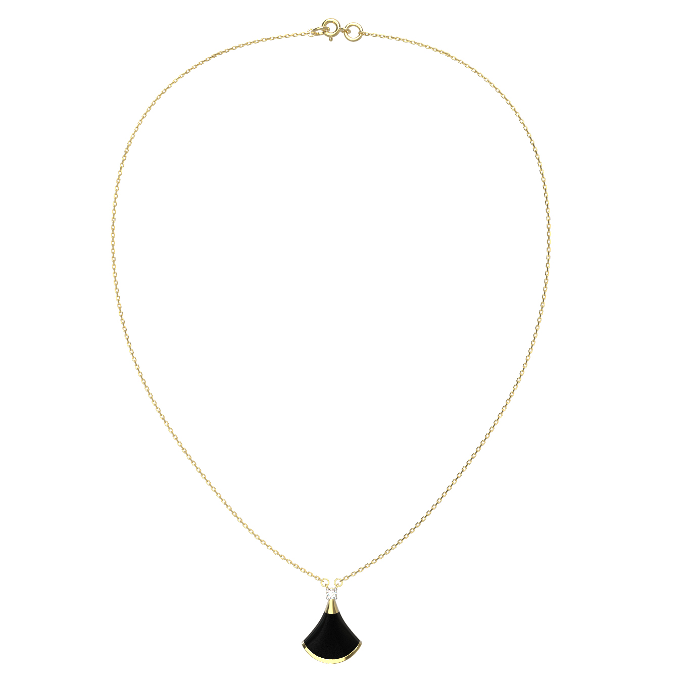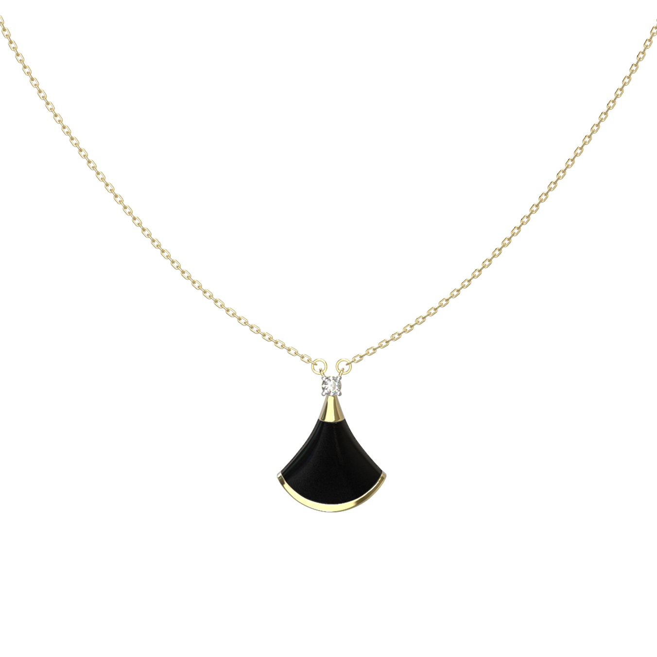 Элегантное колье из лимонного золота 585 пробы из серии De Luxe — Веер станет идеальным завершением вашего образа. Дизайнерское решение в форме веера придает украшению особую утонченность и узнаваемый шарм. Благородный блеск лимонного золота гармонично подчеркивается контрастным сочетанием вставок: глубокого черного оникса и сверкающего белого бриллианта круглой огранки. В изделии используется 6 вставок, которые создают сбалансированную композицию, приковывающую взгляд.