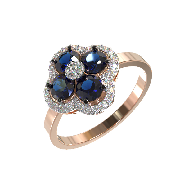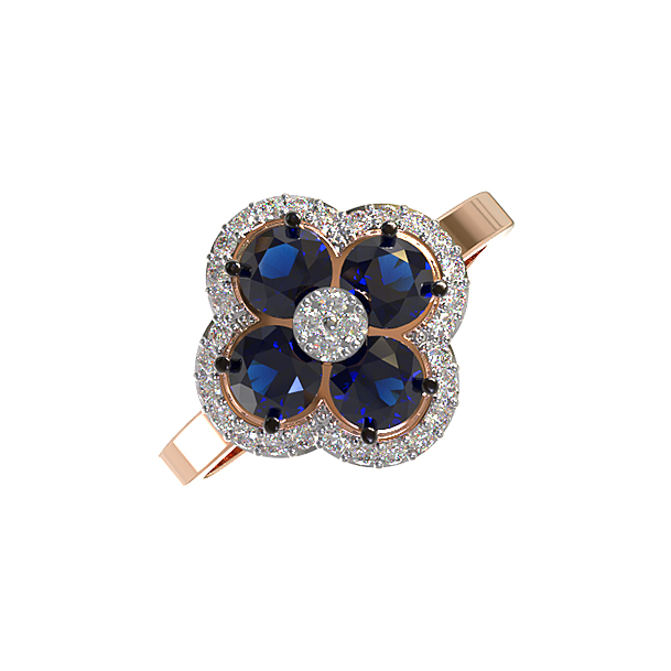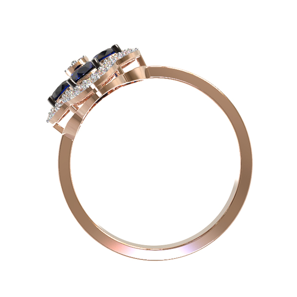 В изделии гармонично сочетаются 36 вставок круглой формы: глубокие синие сапфиры создают насыщенный контраст с ослепительными белыми бриллиантами. Теплый оттенок красного золота подчеркивает чистоту камней и добавляет изделию особую выразительность. Такое кольцо можно приобрести как отдельный аксессуар или дополнить им гармоничный комплект украшений.