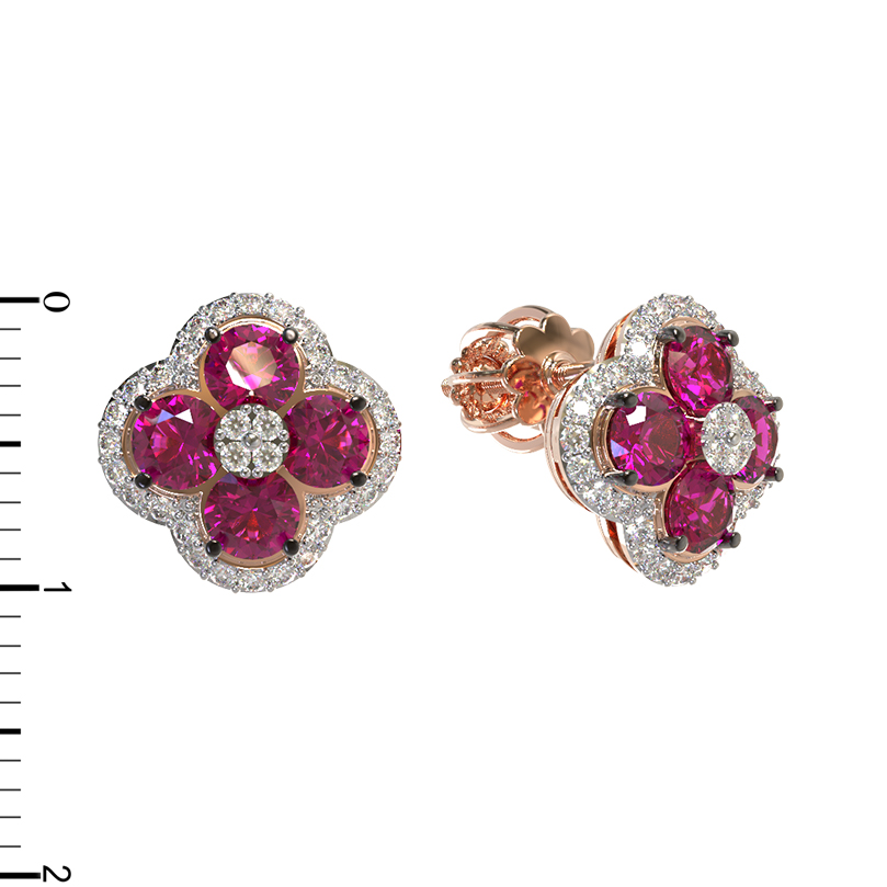 Центральным элементом композиции выступают глубокие красные рубины круглой формы, которые притягивают взгляд своим живым блеском. Их благородный цвет эффектно контрастирует с сиянием 72 вставок из белых бриллиантов, также имеющих классическую круглую форму. Детально проработанная ювелирная композиция в виде четырехлистника выглядит женственно и благородно, при этом благодаря лаконичности исполнения, серьги могут гармонично вписаться и в мужской стиль, становясь ярким акцентом.