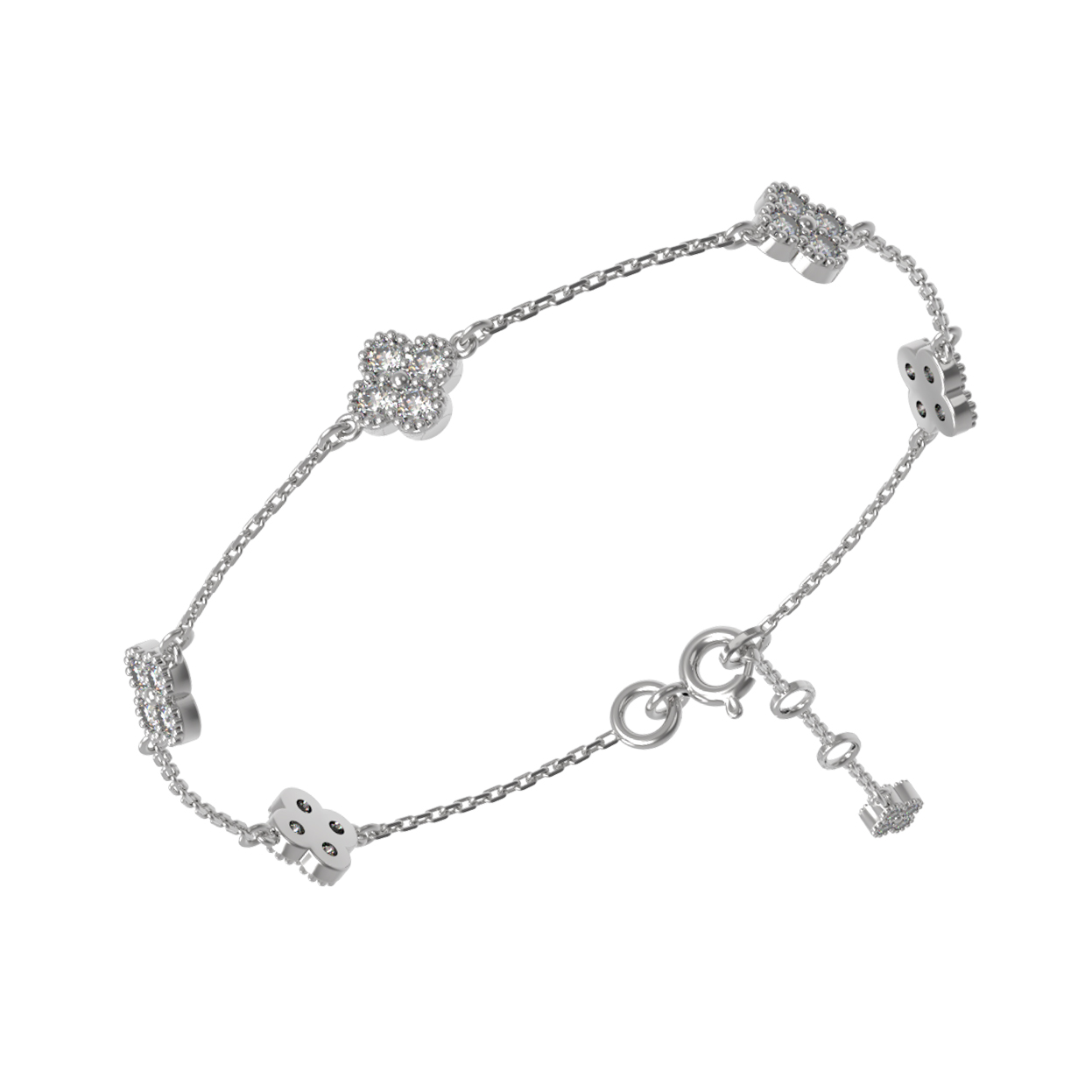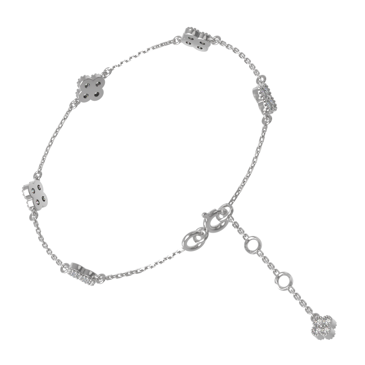 Центральными элементами композиции выступают изящные вставки в форме цветков, инкрустированные бриллиантами. Всего в изделии использовано 28 бриллиантов круглой огранки, которые обладают чистым белым цветом и великолепно преломляют свет при каждом движении руки. Тонкая, но прочная цепочка обеспечивает комфортную посадку на запястье, а надежный замок гарантирует уверенность в сохранности украшения.