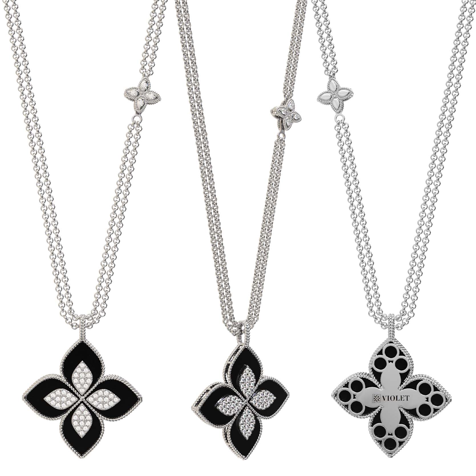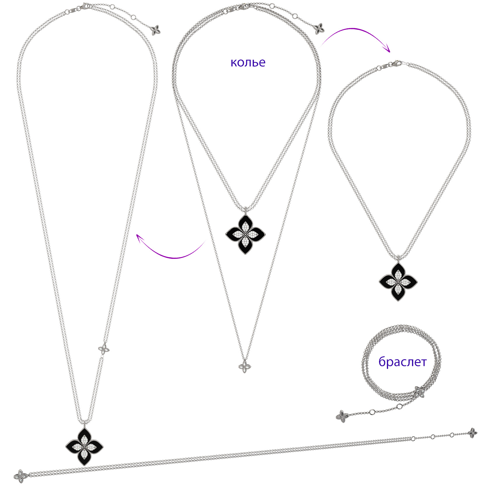 Центральный элемент композиции декорирован вставками в форме лепестка, которые дополнены 56 драгоценными камнями круглой огранки. Гармоничная игра белых бриллиантов и черного оникса придает изделию особое благородство. Это универсальное колье разработано как для женщин, так и для мужчин, предпочитающих статусные аксессуары с глубоким эстетическим смыслом.