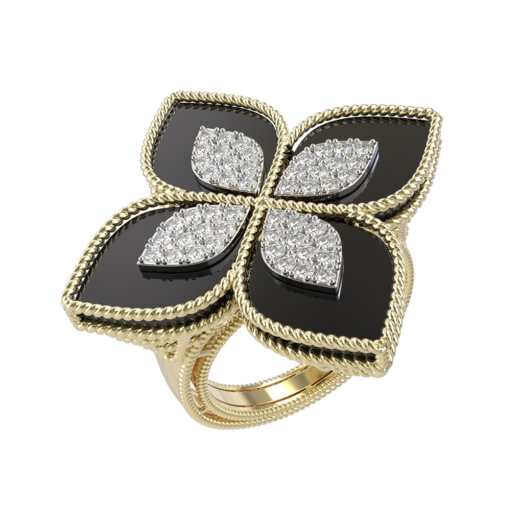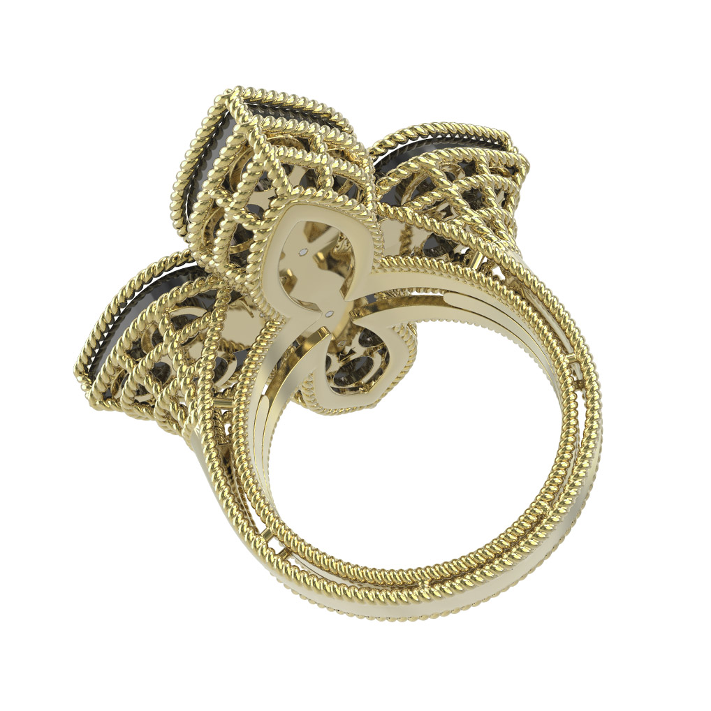 Декоративная часть кольца привлекает внимание искусной работой с формой: вставки в виде лепестков создают гармоничную композицию из 52 драгоценных камней. Контраст черного и белого цвета в сочетании с теплым оттенком золота делает это украшение универсальным аксессуаром, который подойдет как для женщин, так и для мужчин. Благодаря своему статусному виду, данное кольцо отлично смотрится в составе комплектов, позволяя создавать завершенные ювелирные ансамбли.