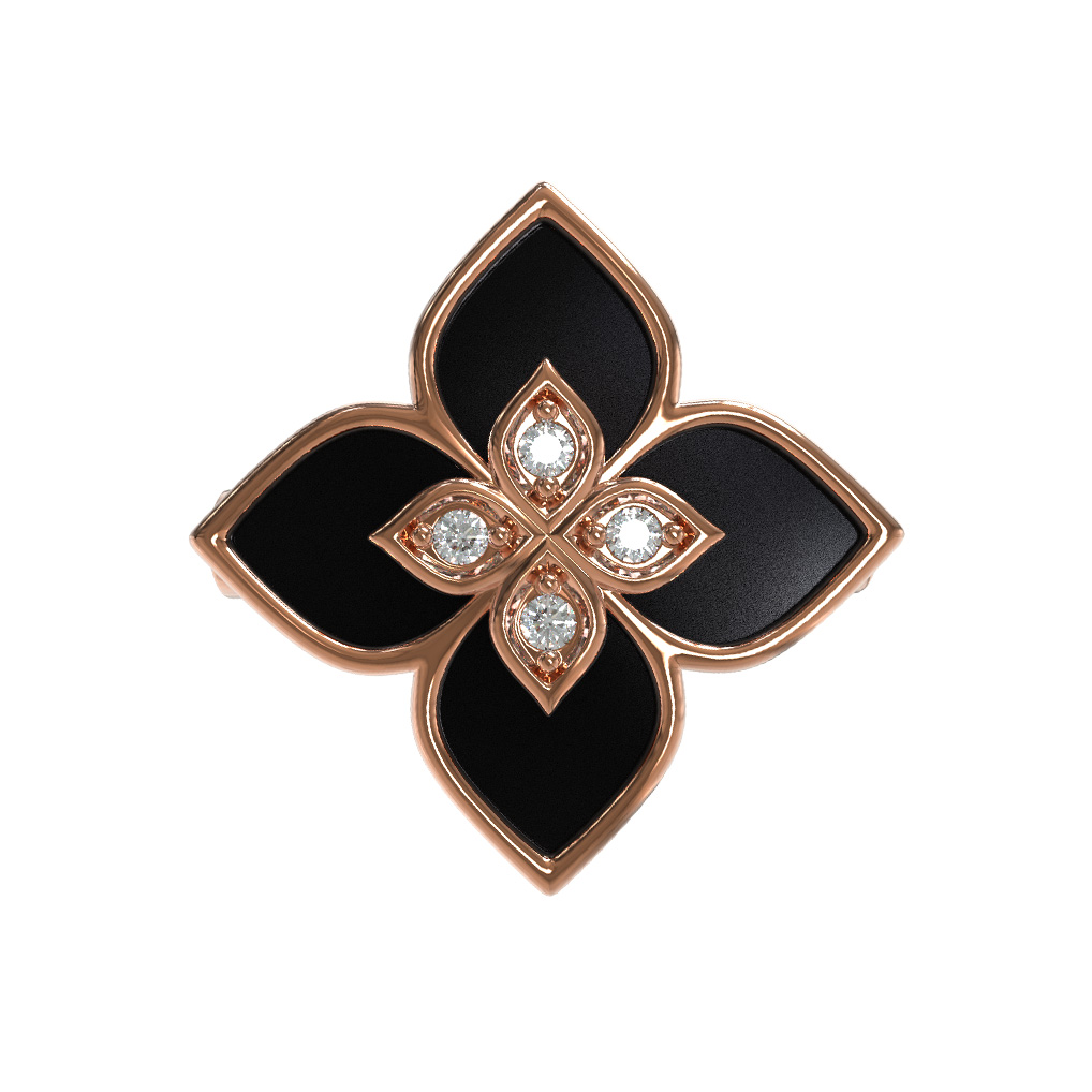 Декоративный элемент украшен пятью вставками: глубокий черный оникс создает драматичный фон, на котором ярко сияют белые бриллианты круглой огранки. Гармоничное сочетание черных и белых камней придает изделию статусность и делает его универсальным акцентом как для вечернего, так и для повседневного образа. Тщательная проработка деталей подчеркивает высокий статус владельца.