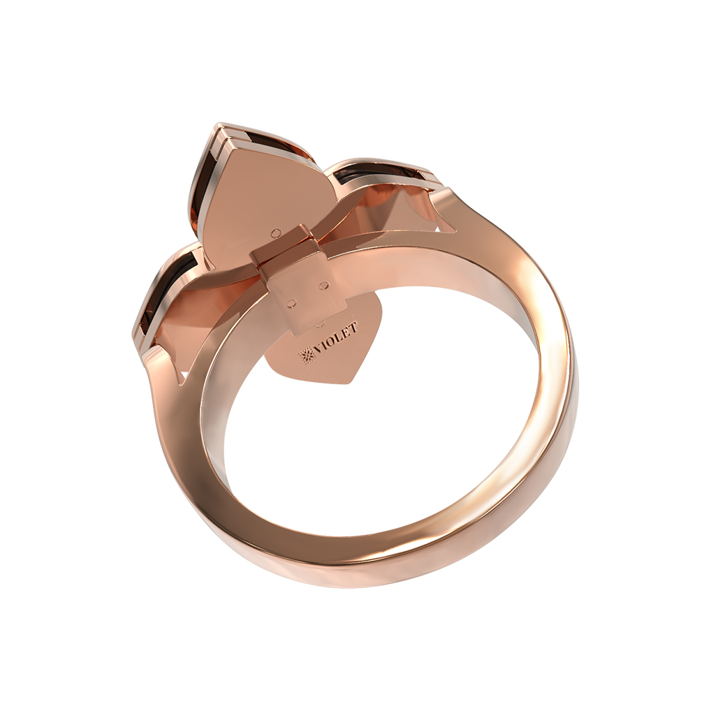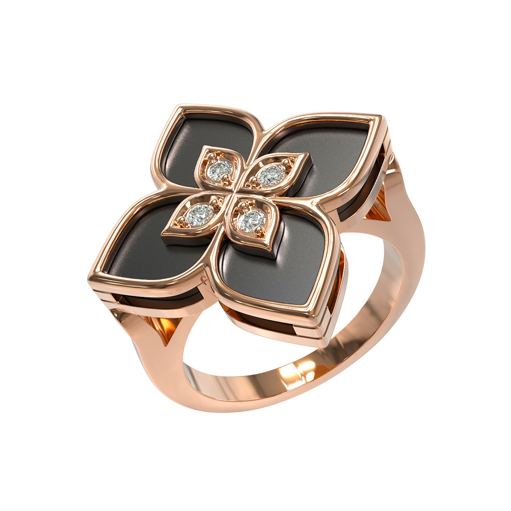 Роскошное кольцо из коллекции De Luxe — Венецианская принцесса воплощает безупречный стиль и глубокую символику. Украшение выполнено из красного золота 585 пробы, чей теплый оттенок идеально подчеркивает контрастное сочетание вставок. В центре композиции — выразительный дизайн в форме четырехлистника, символизирующего удачу и благополучие.