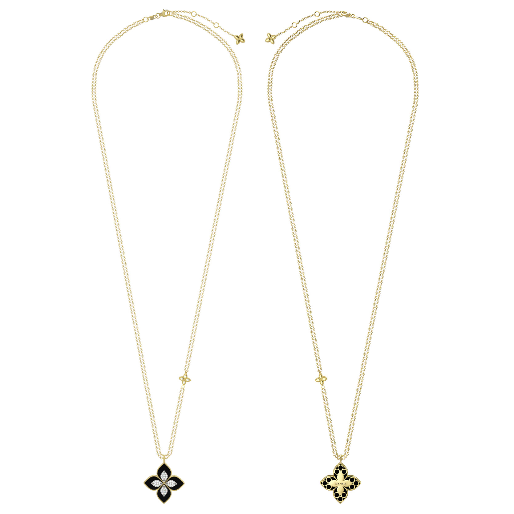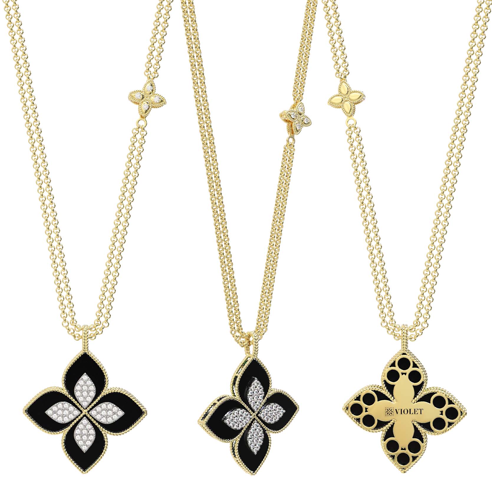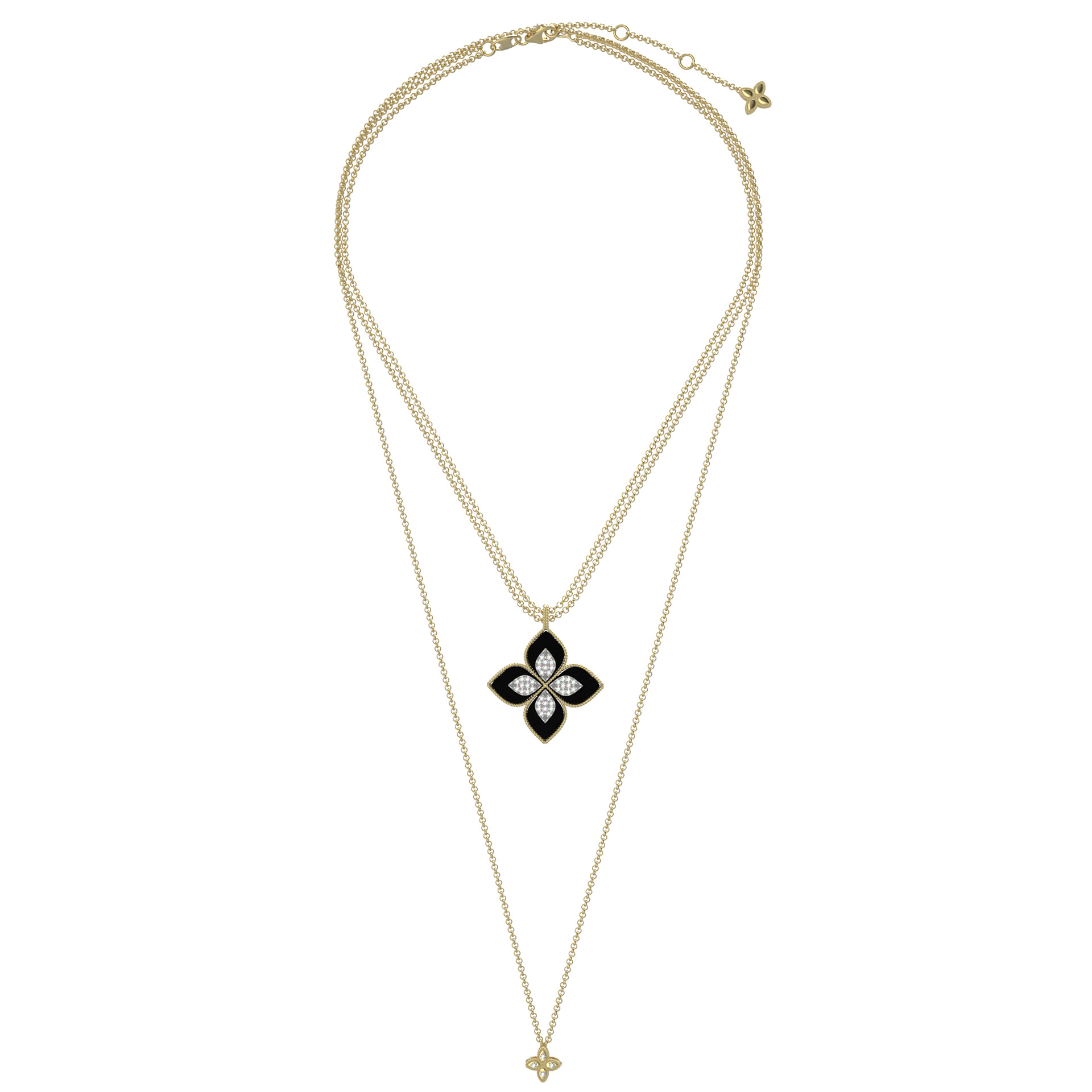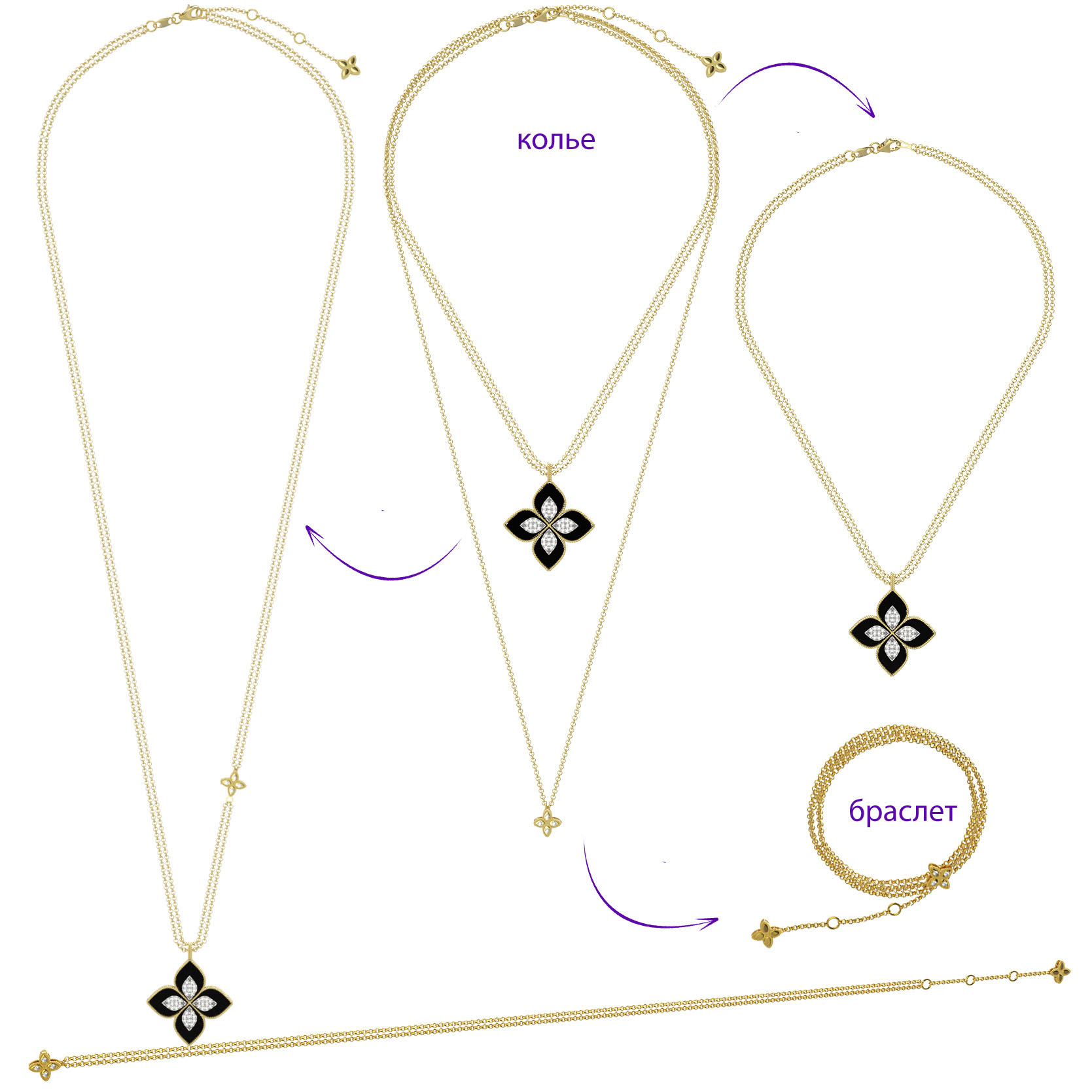Особый шарм украшению придает контрастная игра вставок: глубокий черный оникс в форме лепестка гармонично сочетается с сияющими белыми бриллиантами круглой огранки. Всего в изделии использовано 56 драгоценных вставок, которые создают неповторимый блеск при каждом движении. Многослойная конструкция цепочки добавляет колье динамики и делает его визуально интересным.