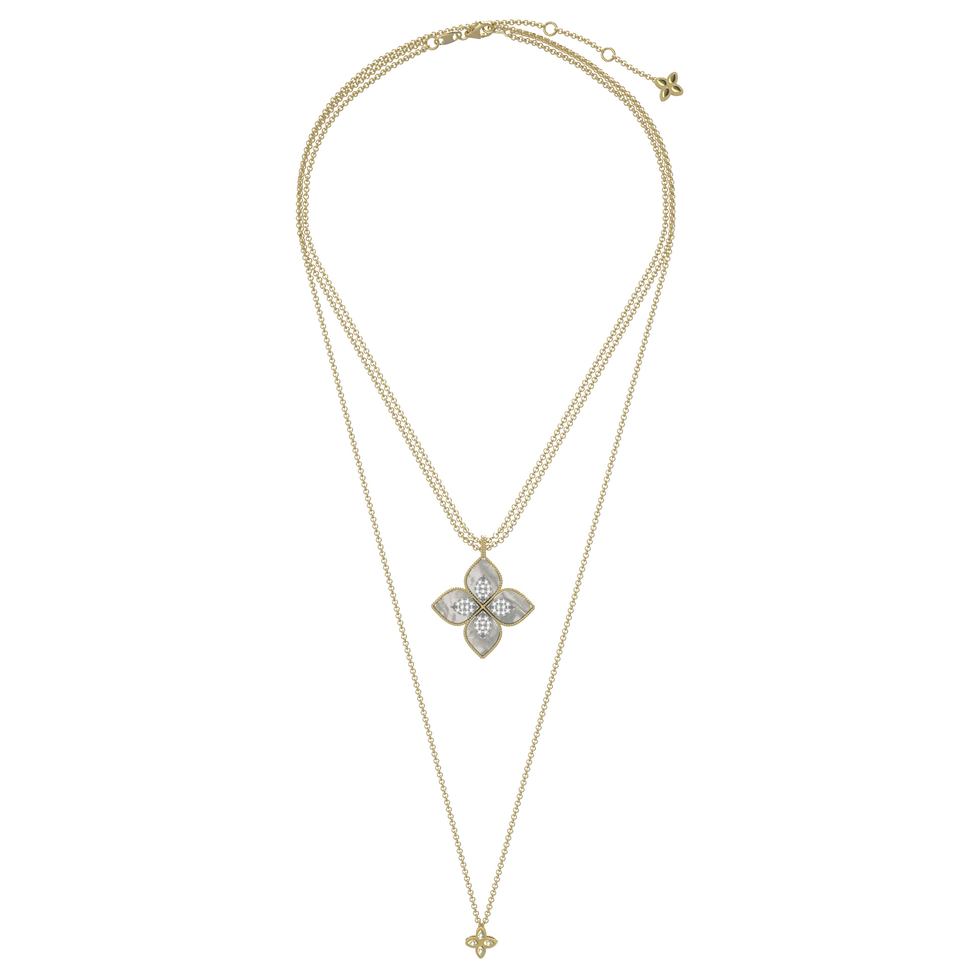 Особое очарование украшению придает контрастная игра вставок. Перламутр с его мягким внутренним свечением в форме лепестков эффектно дополнен 52 бриллиантами круглой огранки. Белый цвет камней и перламутра безупречно сочетается с лимонным золотом, рождая гармоничный союз роскоши и природной красоты. Универсальность дизайна позволяет носить это колье как женщинам, так и мужчинам, предпочитающим утонченные аксессуары.
