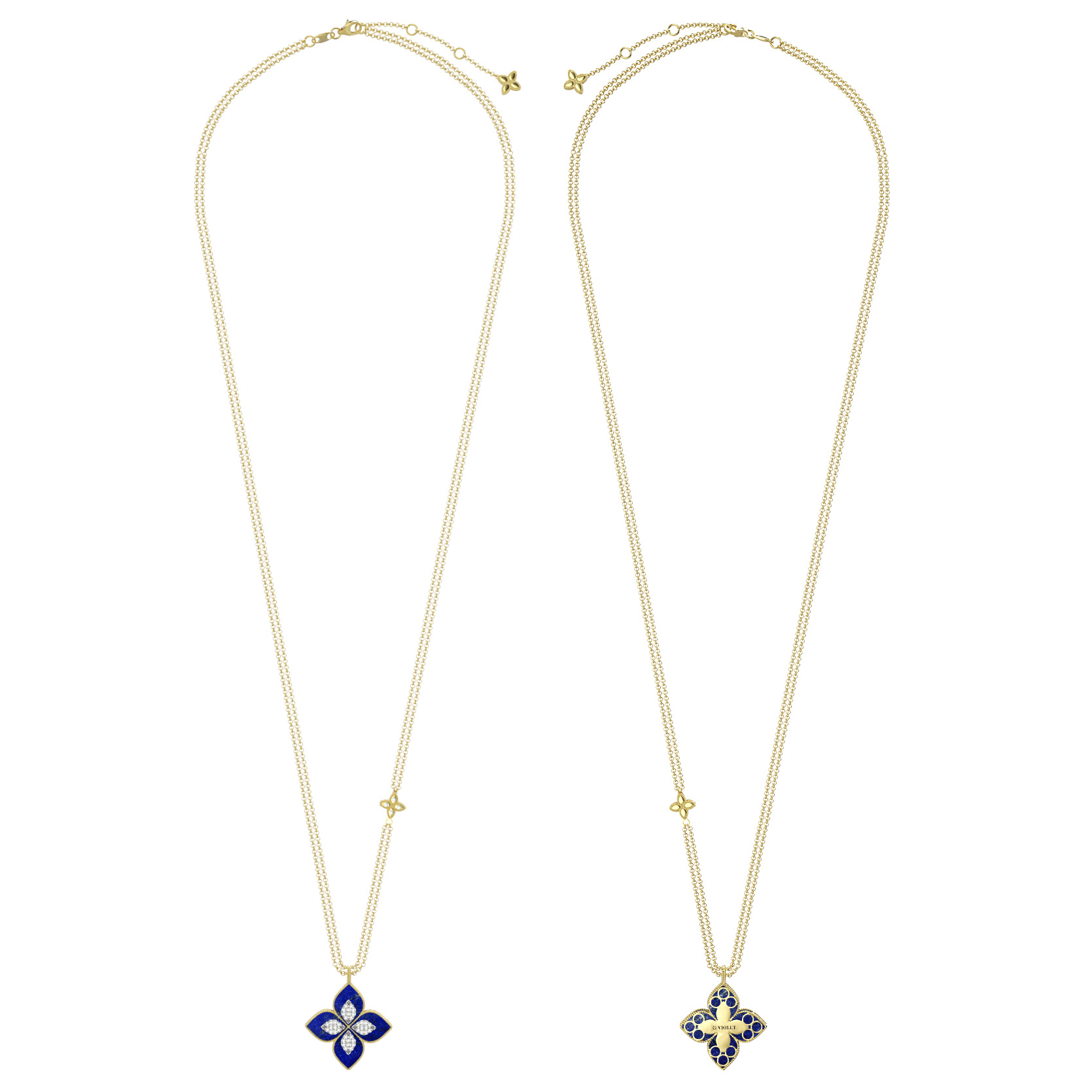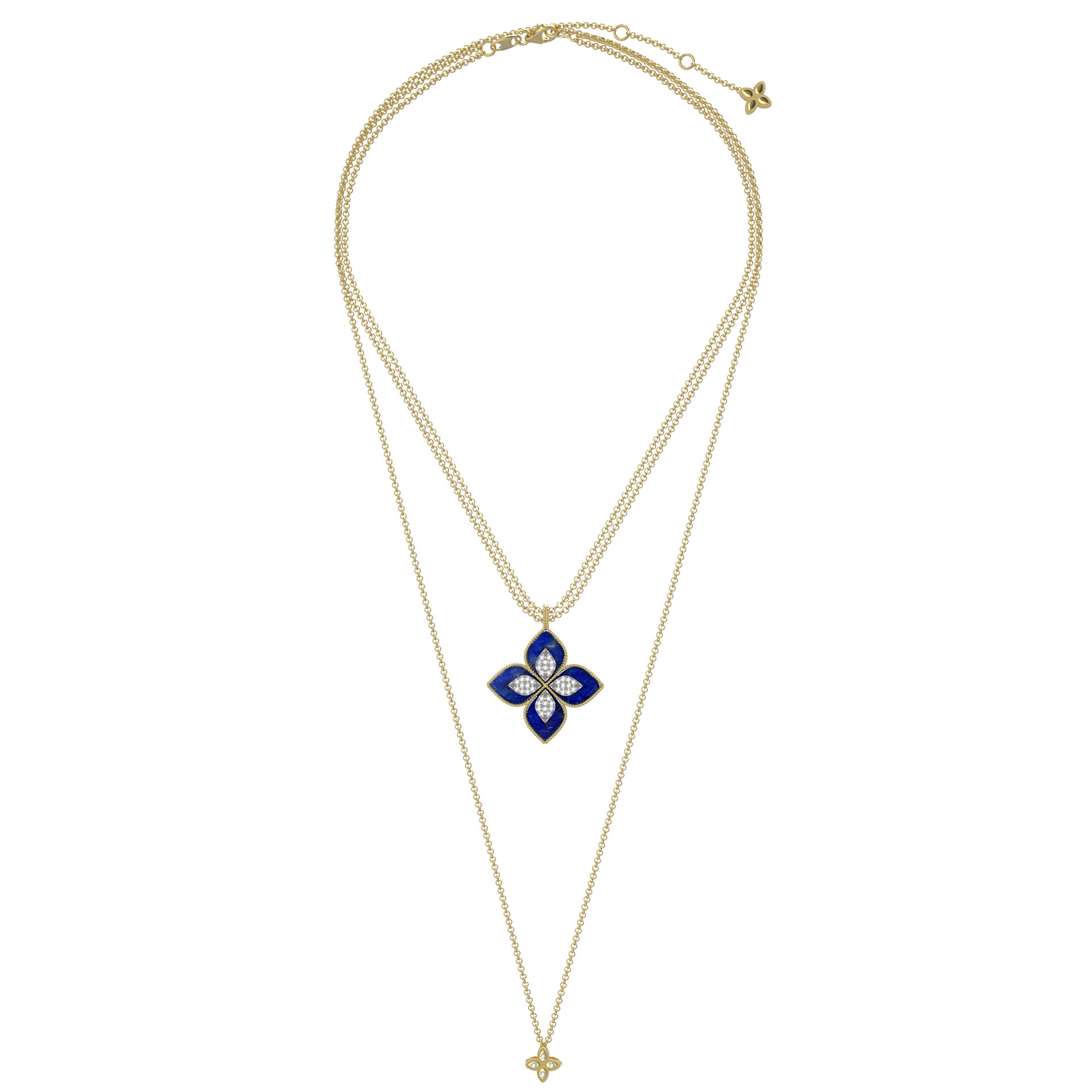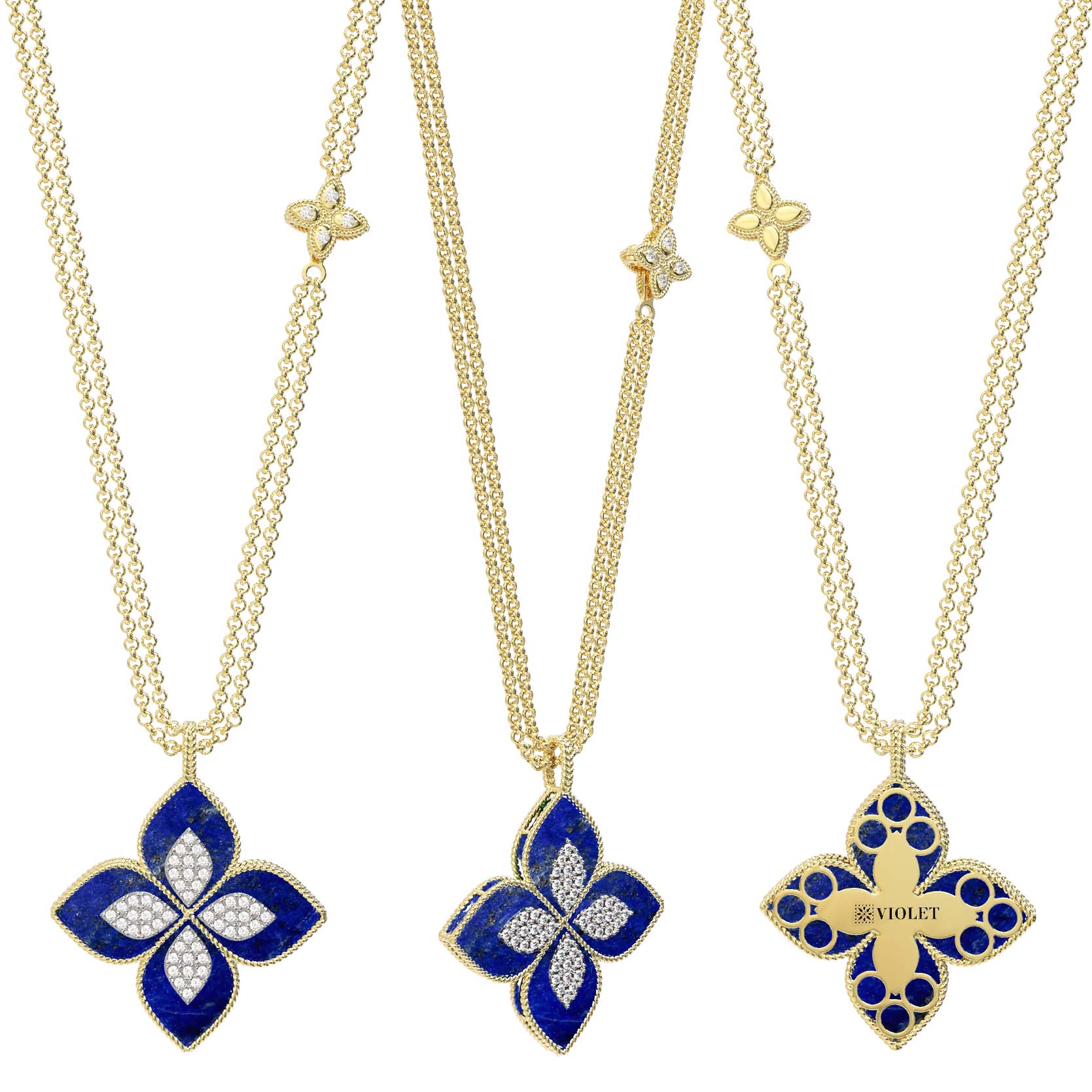 Роскошное колье из лимонного золота 585 пробы — воплощение ювелирного искусства, вдохновленное эстетикой De Luxe — Венецианская принцесса. Этот изысканный аксессуар сочетает в себе благородный оттенок драгоценного металла с глубоким, насыщенным цветом натурального лазурита. Центральный элемент дизайна выполнен в форме нежного клевера, лепестки которого создают гармоничный контраст синего цвета вставки и сияния 56 бриллиантов.