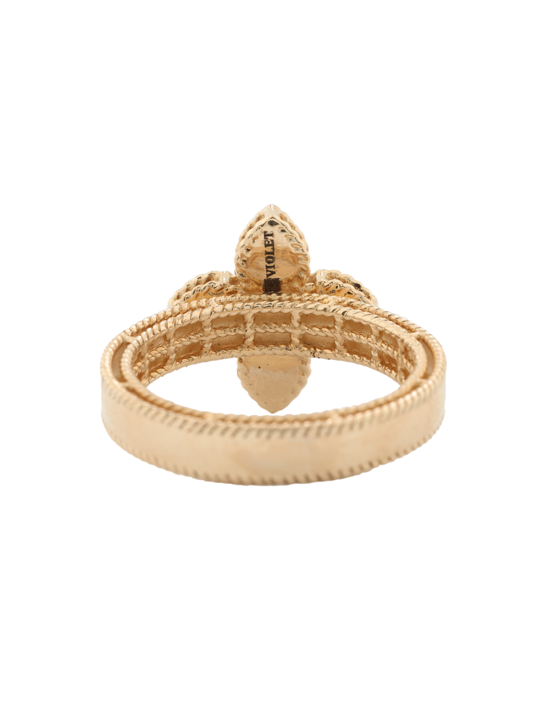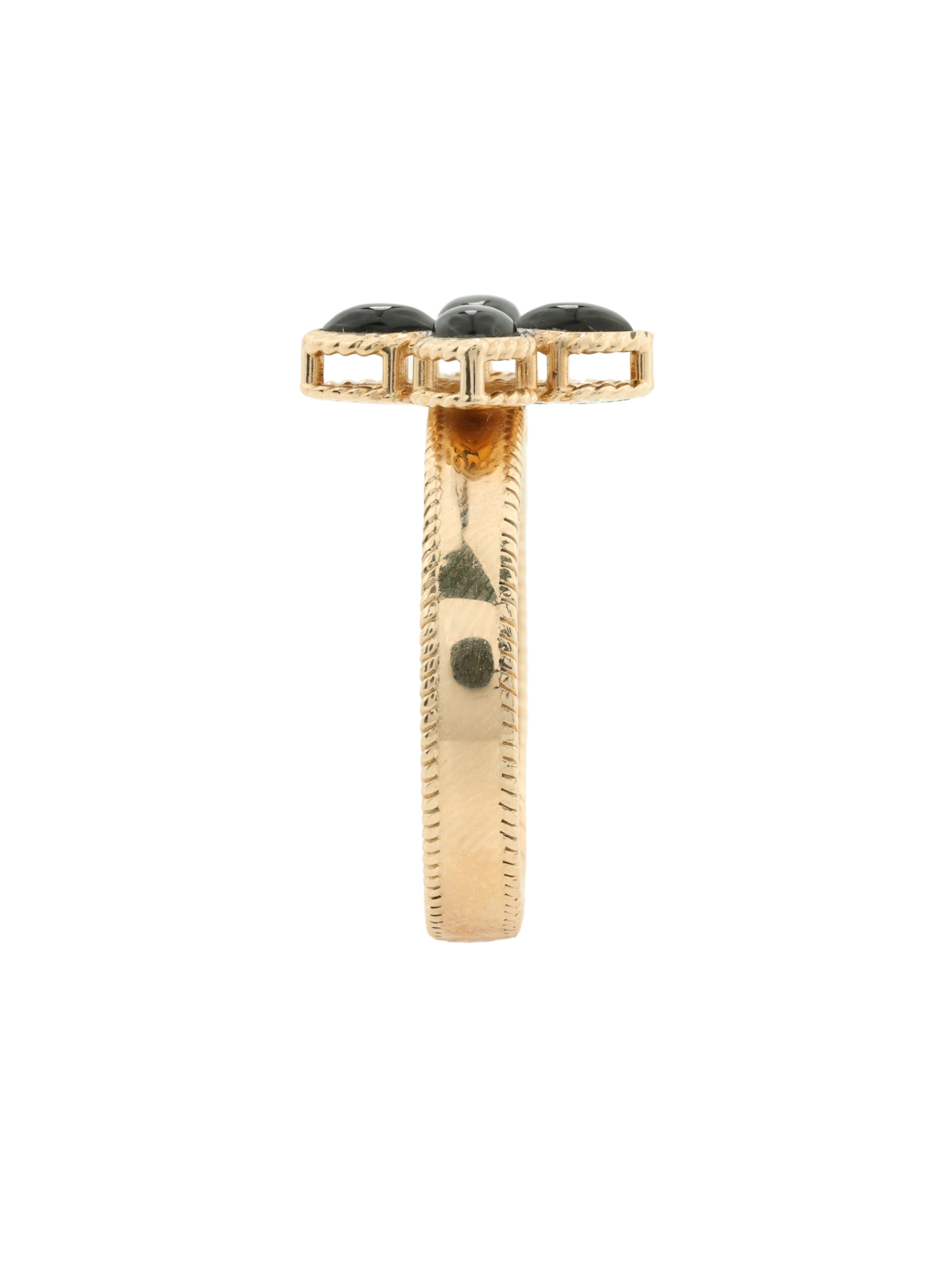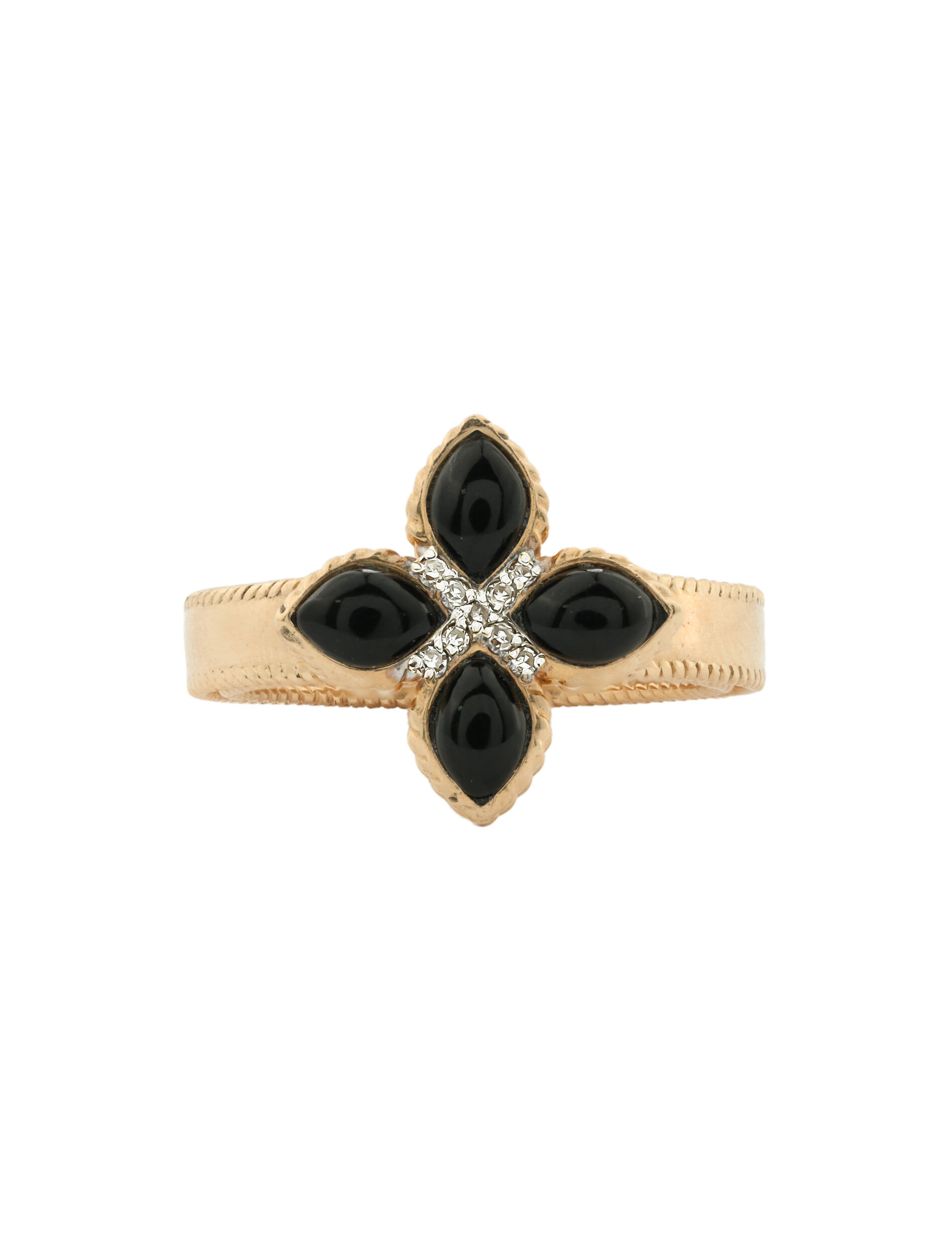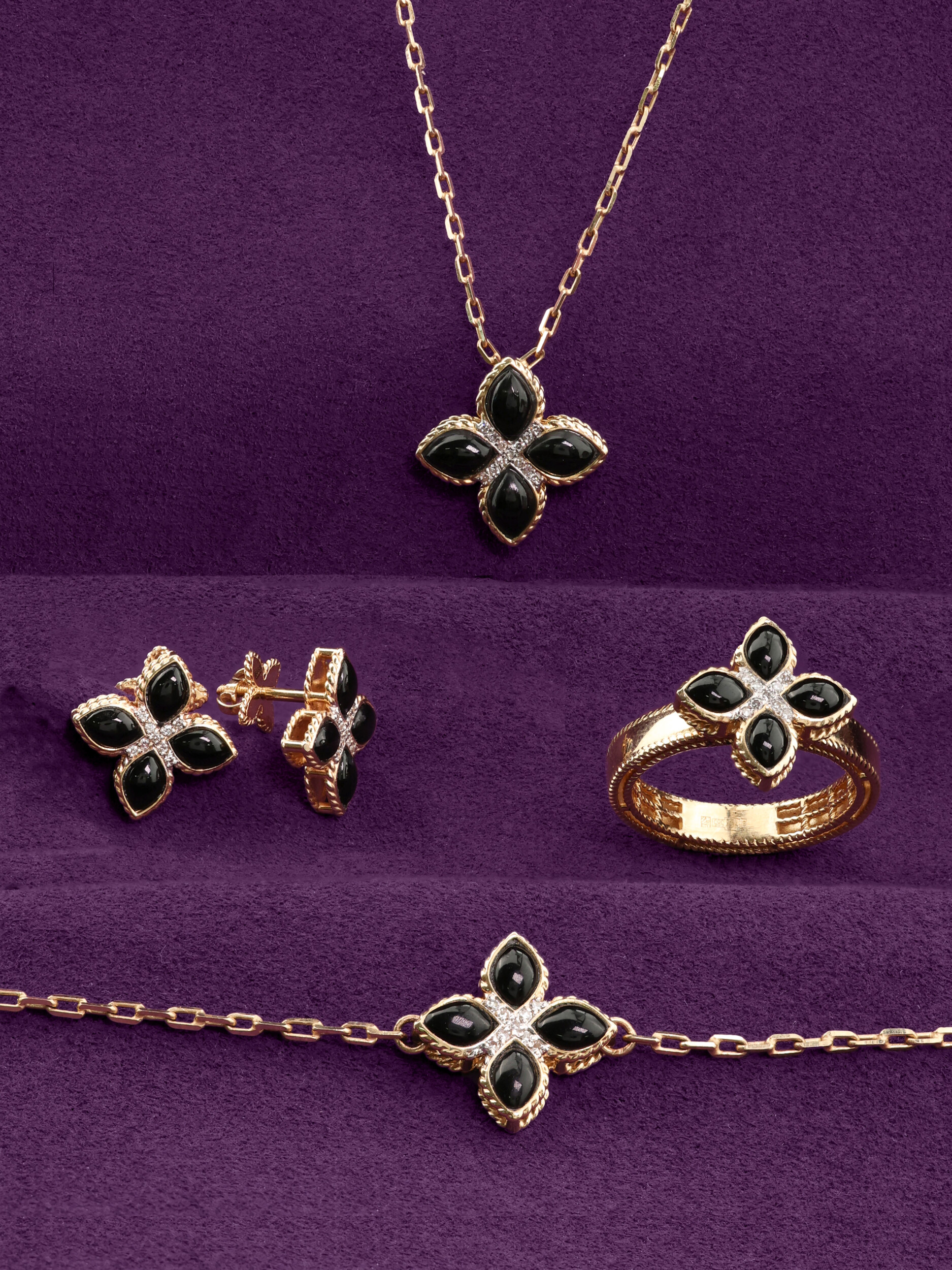 Изысканное кольцо из красного золота 585 пробы станет утонченным дополнением вашего образа. Это украшение из коллекции De Luxe — Венецианская принцесса выполнено в стиле клевер, который давно стал символом элегантности и безупречного вкуса. В центре композиции расположены четыре вставки в форме лепестка из глубокого черного оникса, гармонично сочетающиеся с блеском 13 вставок из прозрачных бриллиантов круглой огранки.