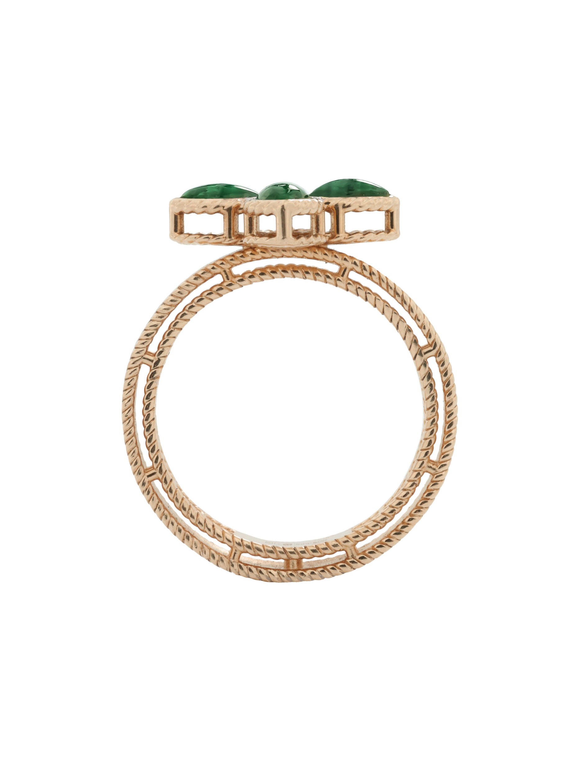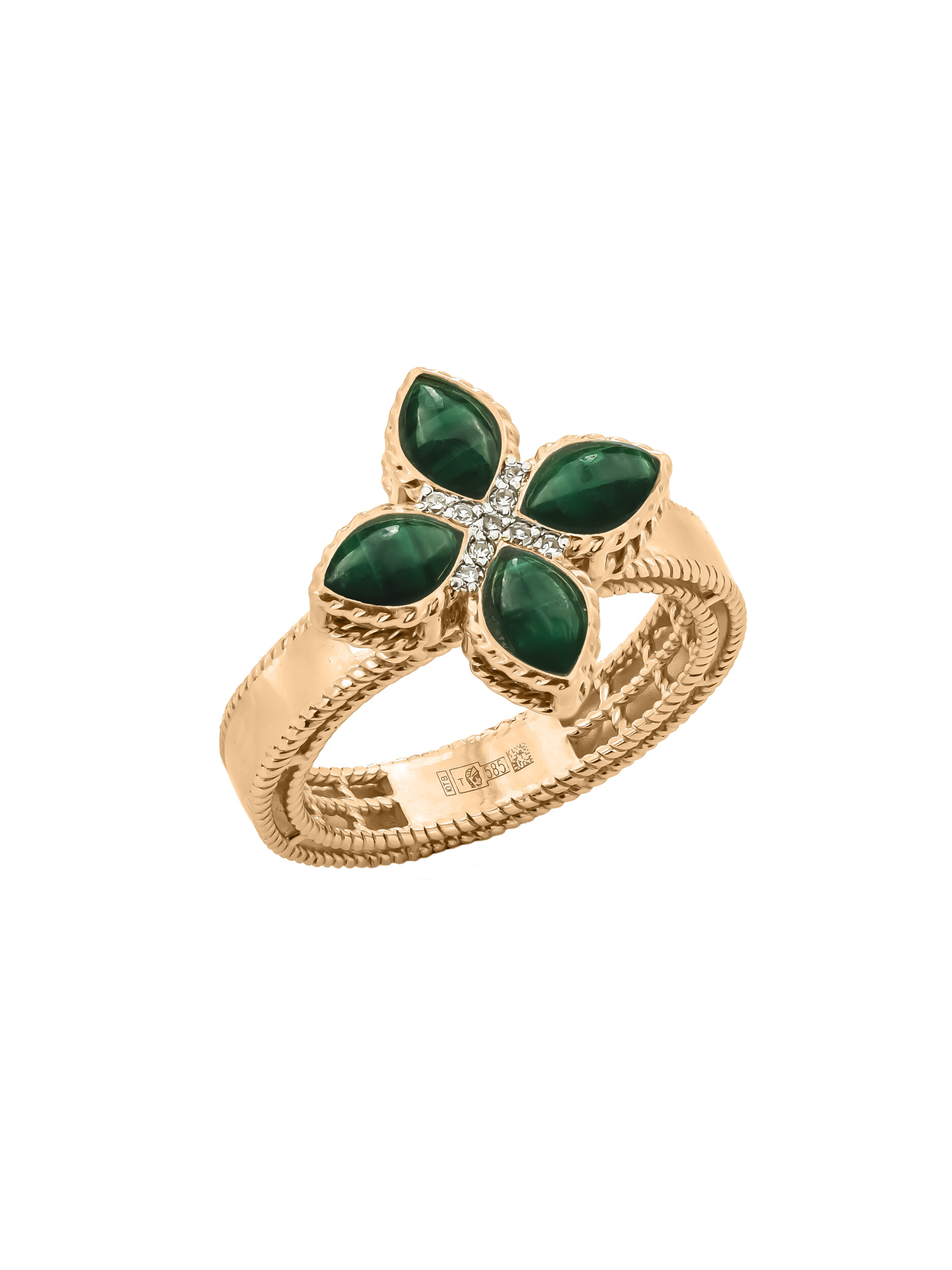 Кольцо из красного золота 585 пробы из коллекции De Luxe — Венецианская принцесса станет безупречным акцентом вашего образа. Дизайн изделия воплощает эстетику классического клевера, где природная красота камней сочетается с благородным металлом. Центральным элементом композиции является искусная инкрустация: насыщенный зеленый малахит в форме лепестка подчеркивает глубину оттенка красного золота, а сверкающие белые бриллианты круглой огранки добавляют украшению роскошного сияния. Всего в изделии использовано 13 вставок, создающих гармоничный и выразительный ансамбль.