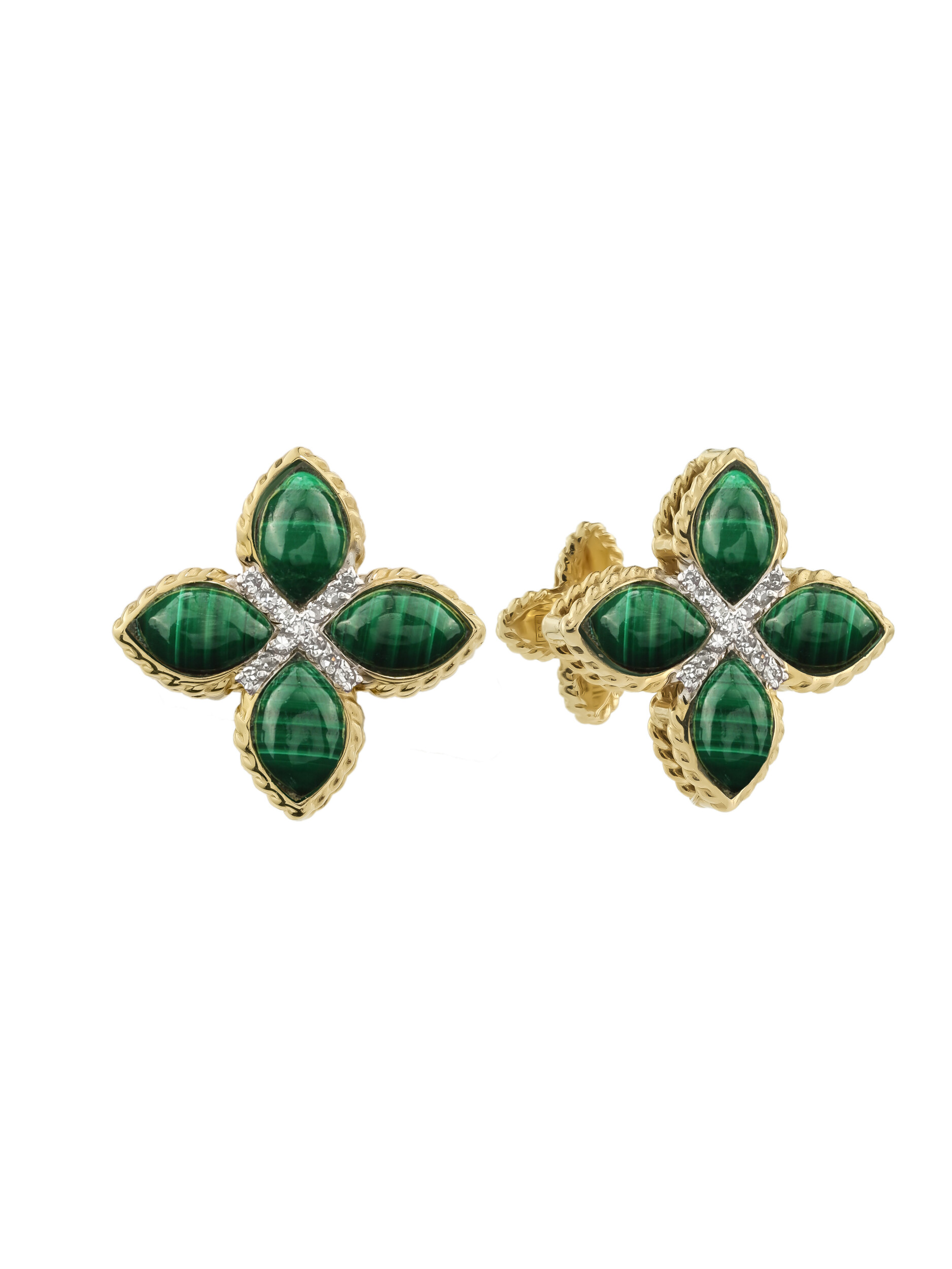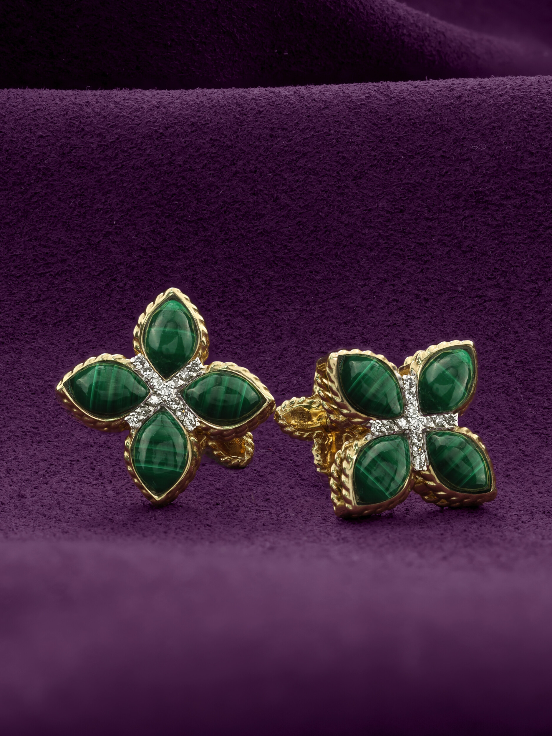 Роскошные серьги из лимонного золота 585 пробы из коллекции De Luxe — Венецианская принцесса станут ярким акцентом в вашем образе. Дизайн изделия выполнен в форме клевера, который притягивает взгляд и символизирует удачу. Центральная часть композиции украшена глубоким зеленым малахитом формы лепесток, цвет которого гармонично дополняется блеском белых бриллиантов круглой формы. Всего в изделии использовано 26 вставок, что придает ему особенный шарм и изысканность.