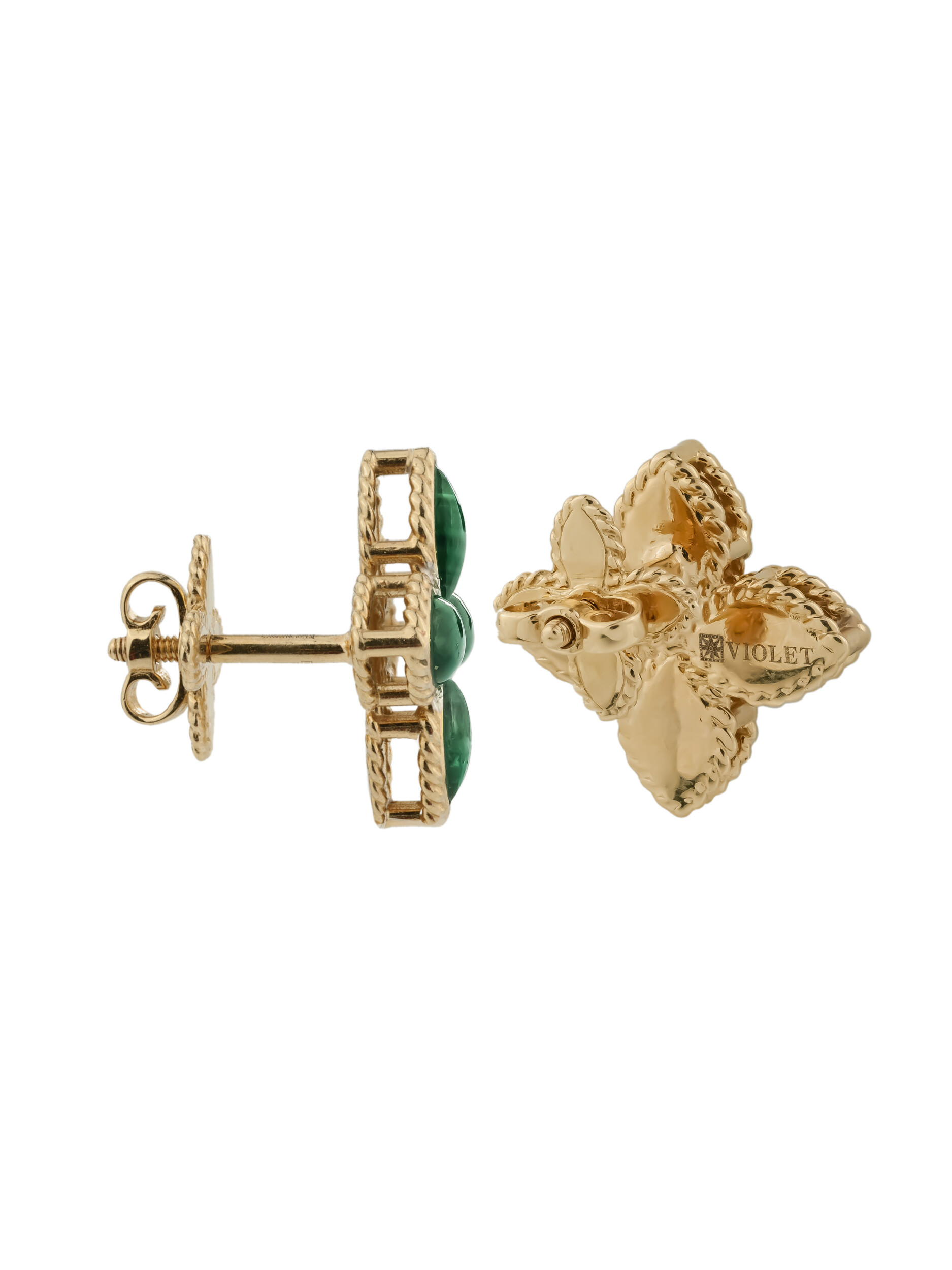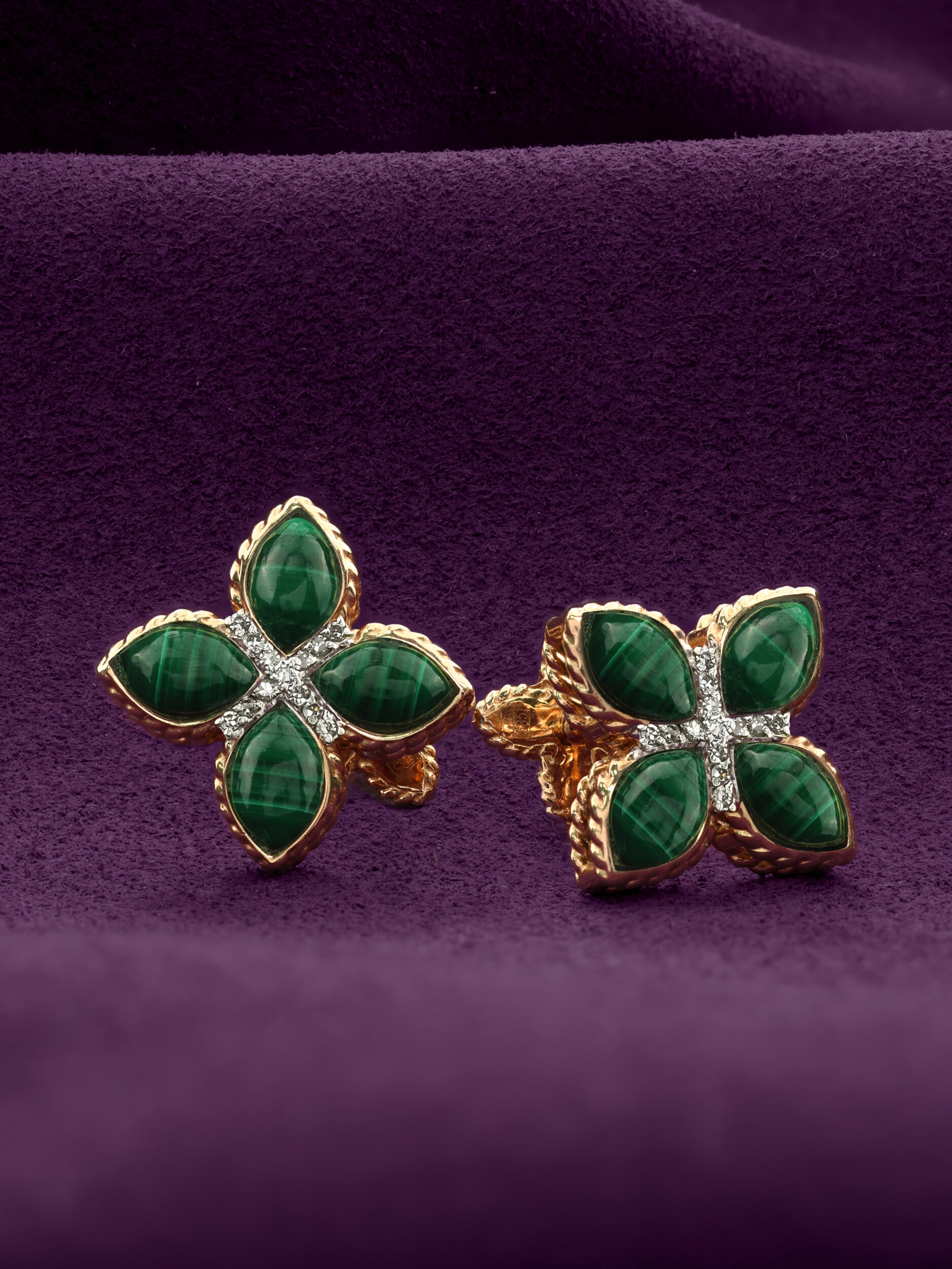Элегантные серьги из красного золота 585 пробы представляют собой воплощение изысканного стиля и благородства. Данное украшение, вошедшее в коллекцию De Luxe — Венецианская принцесса, привлекает внимание своим утонченным дизайном в форме клевера, который гармонично сочетает в себе классические традиции и современные ювелирные тренды. Центральным элементом композиции стали вставки из натурального малахита глубокого зеленого цвета, ограненные в форме нежного лепестка. Их насыщенный природный узор великолепно оттеняется ярким блеском 26 вставок из белых бриллиантов круглой формы, расположенных в самом сердце композиции.