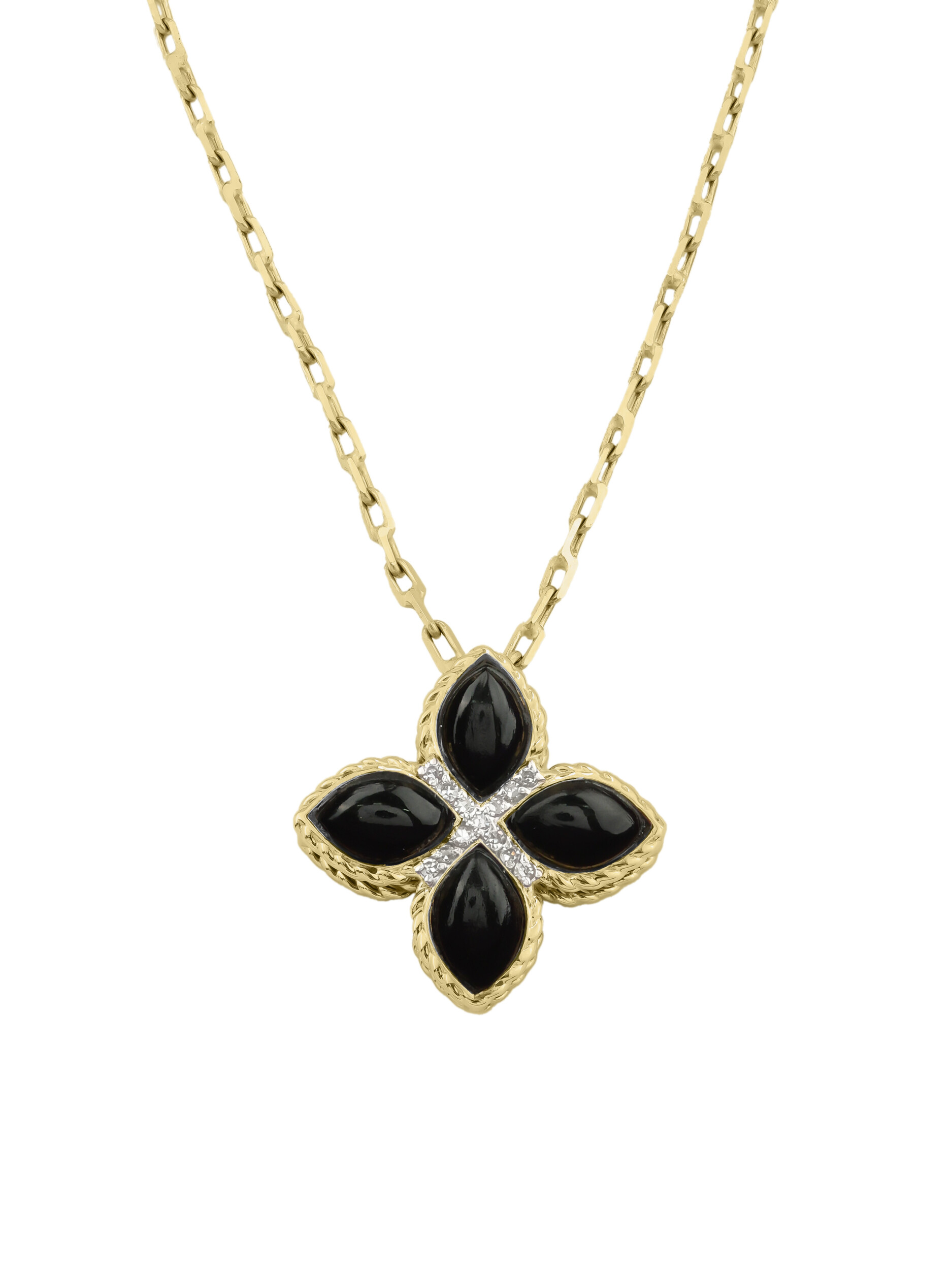 Изысканное колье из лимонного золота 585 пробы из коллекции De Luxe — Венецианская принцесса станет безупречным акцентом вашего образа. Это ювелирное изделие воплощает в себе гармонию контрастов и утонченный стиль. Центральным элементом украшения выступает выразительный дизайн в форме клевера, который притягивает взгляд и подчеркивает статусность владельца. Глубокий черный цвет оникса в форме лепестка идеально сочетается с теплым сиянием лимонного металла, создавая композицию, полную благородства и загадочности.