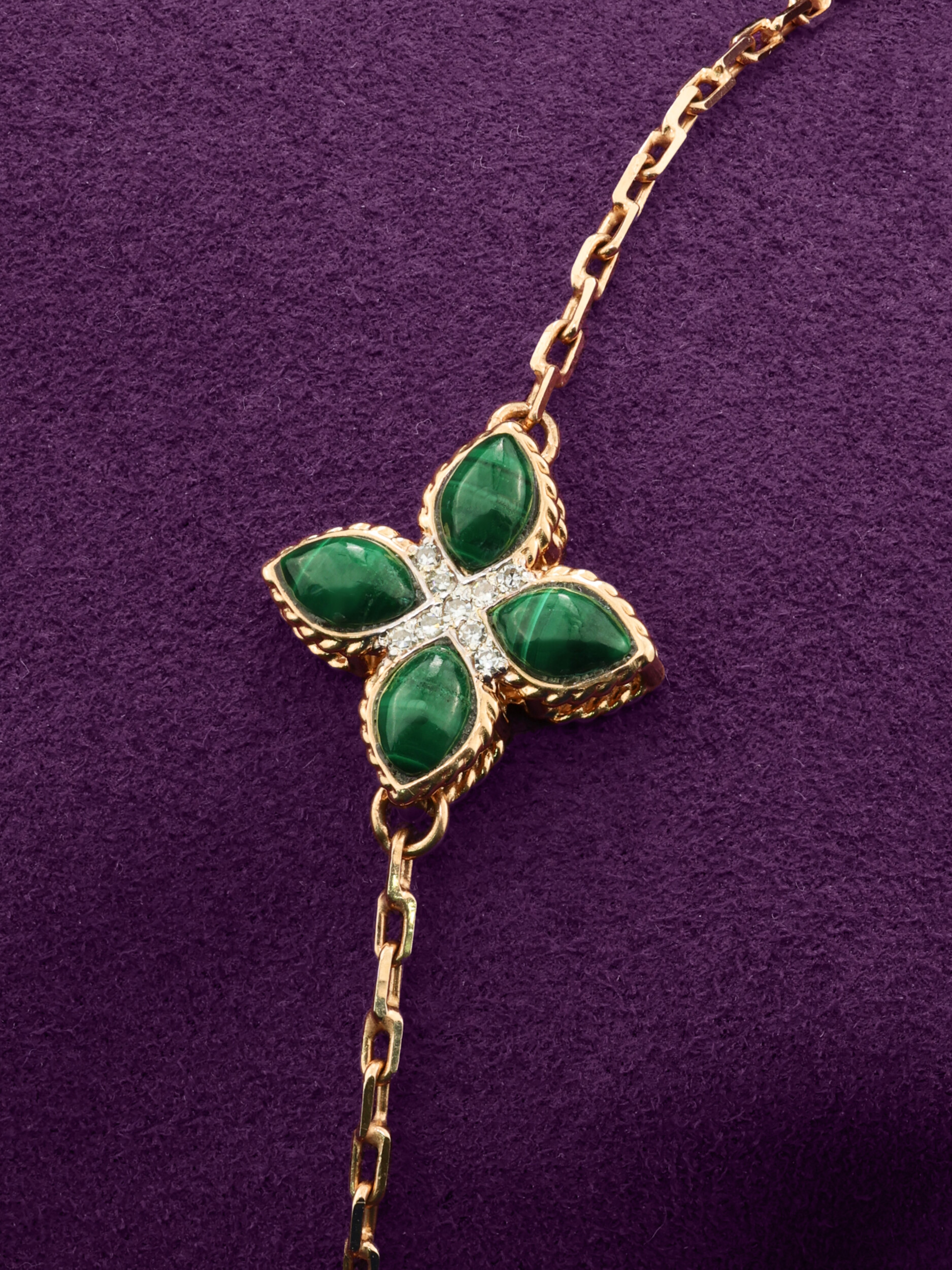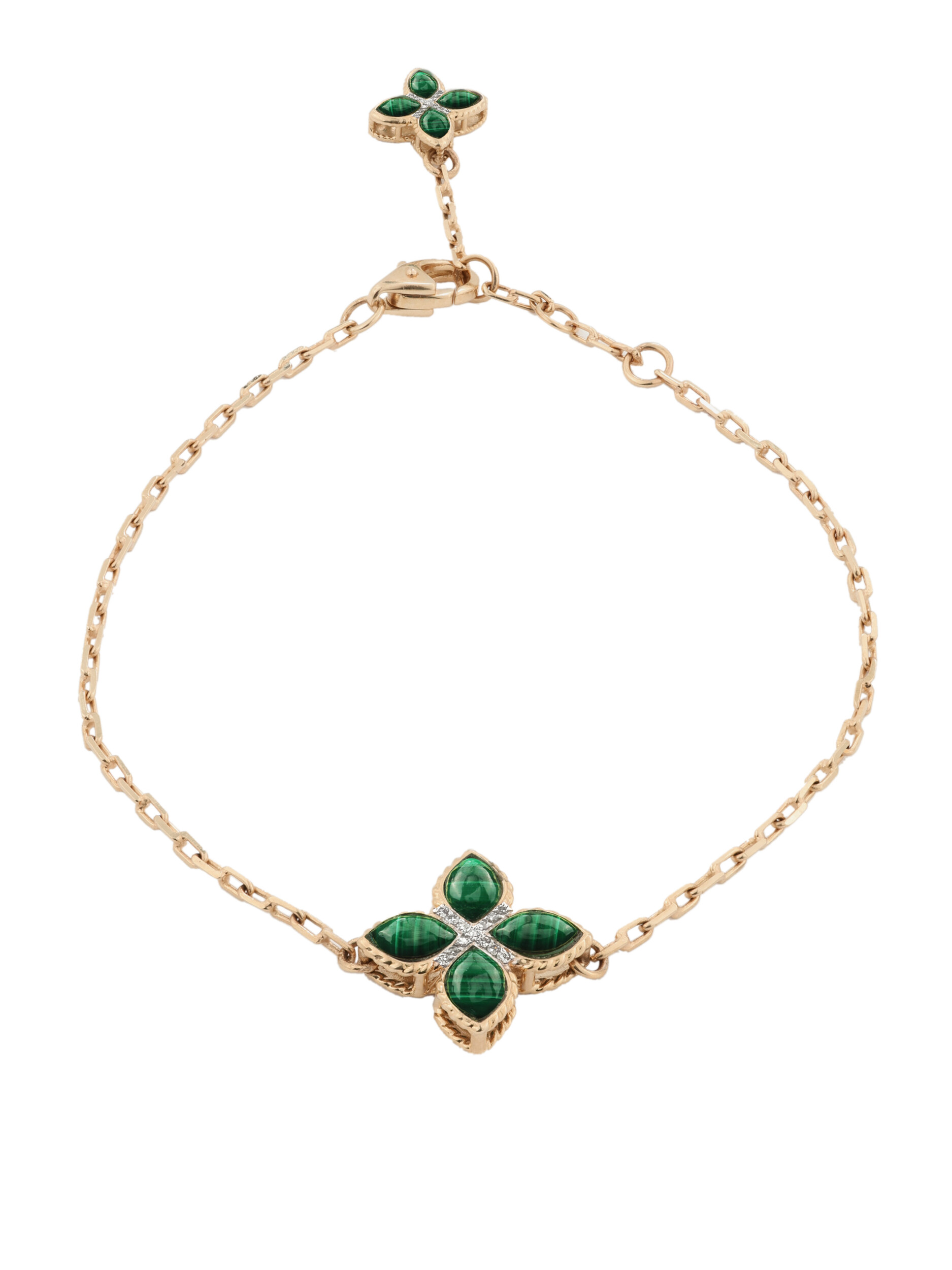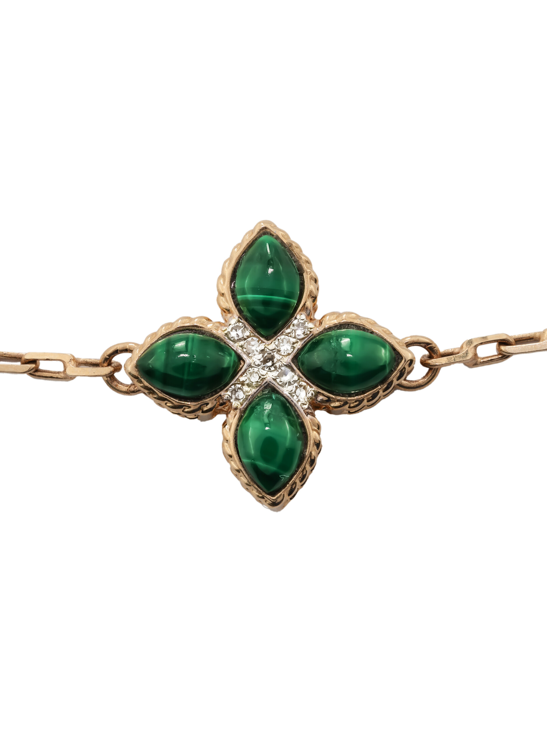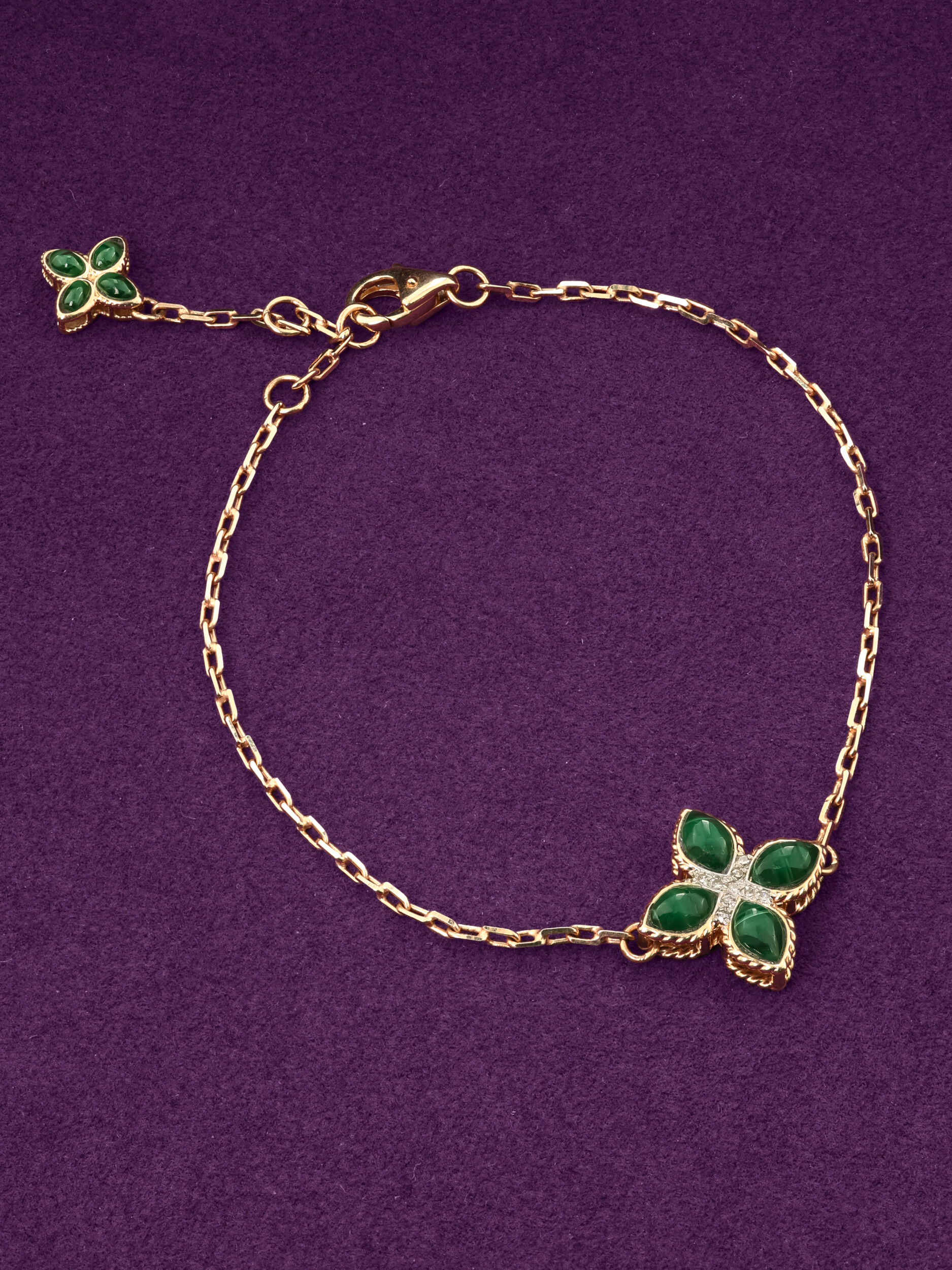 Центральную композицию украшают вставки из глубокого зеленого малахита, ограненные в форме лепестков, которые гармонично сочетаются с блеском белых бриллиантов круглой формы. Всего в изделии использовано 17 вставок, создающих роскошную игру света и цвета на запястье. Тщательная проработка деталей делает это ювелирное изделие настоящим произведением искусства.