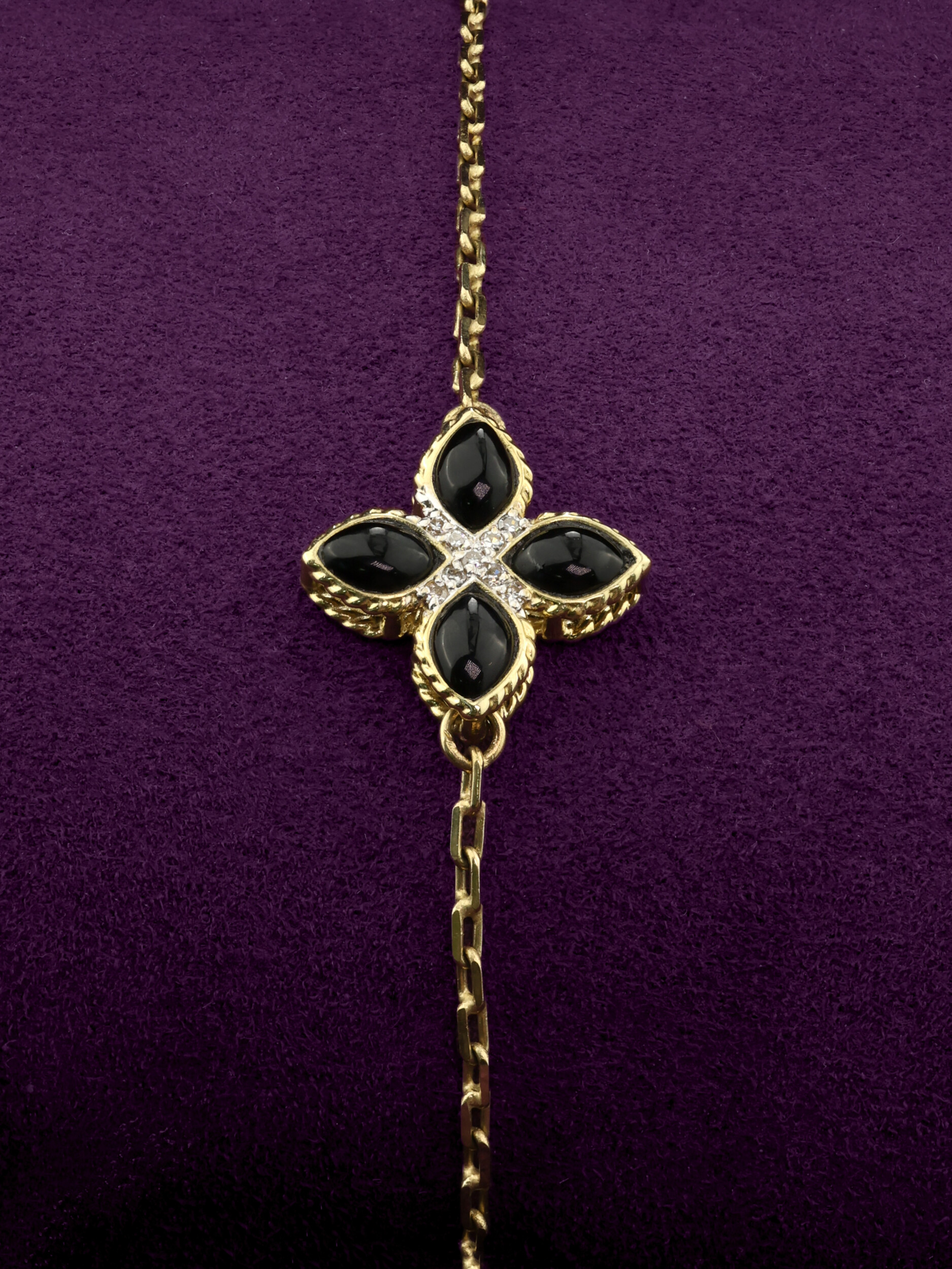 Черные вставки оникса имеют форму лепестка, что придает изделию особое благородство и глубину, в то время как белые круглые бриллианты добавляют ослепительного блеска, подчеркивая сияние лимонного золота. Контрастное сочетание черного и белого цвета вставок делает это ювелирное изделие универсальным — оно идеально дополнит как вечерний наряд, так и строгий повседневный стиль.