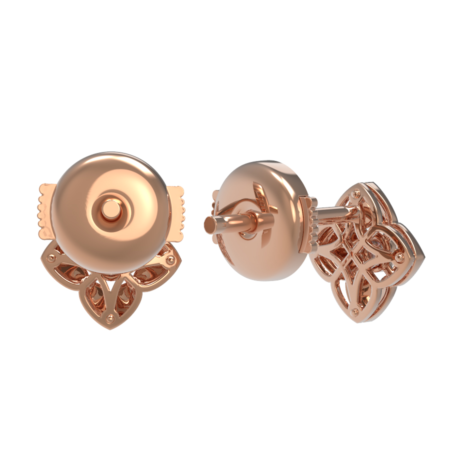 Серьги выполнены в форме нежного цветка, что придает образу легкость и романтичность. В центре каждой композиции расположен сверкающий бриллиант круглой формы с белым цветом вставок, который притягивает взгляд своим холодным блеском на контрасте с красным золотом. Всего в изделии использовано 2 бриллианта, создающих гармоничный дуэт.