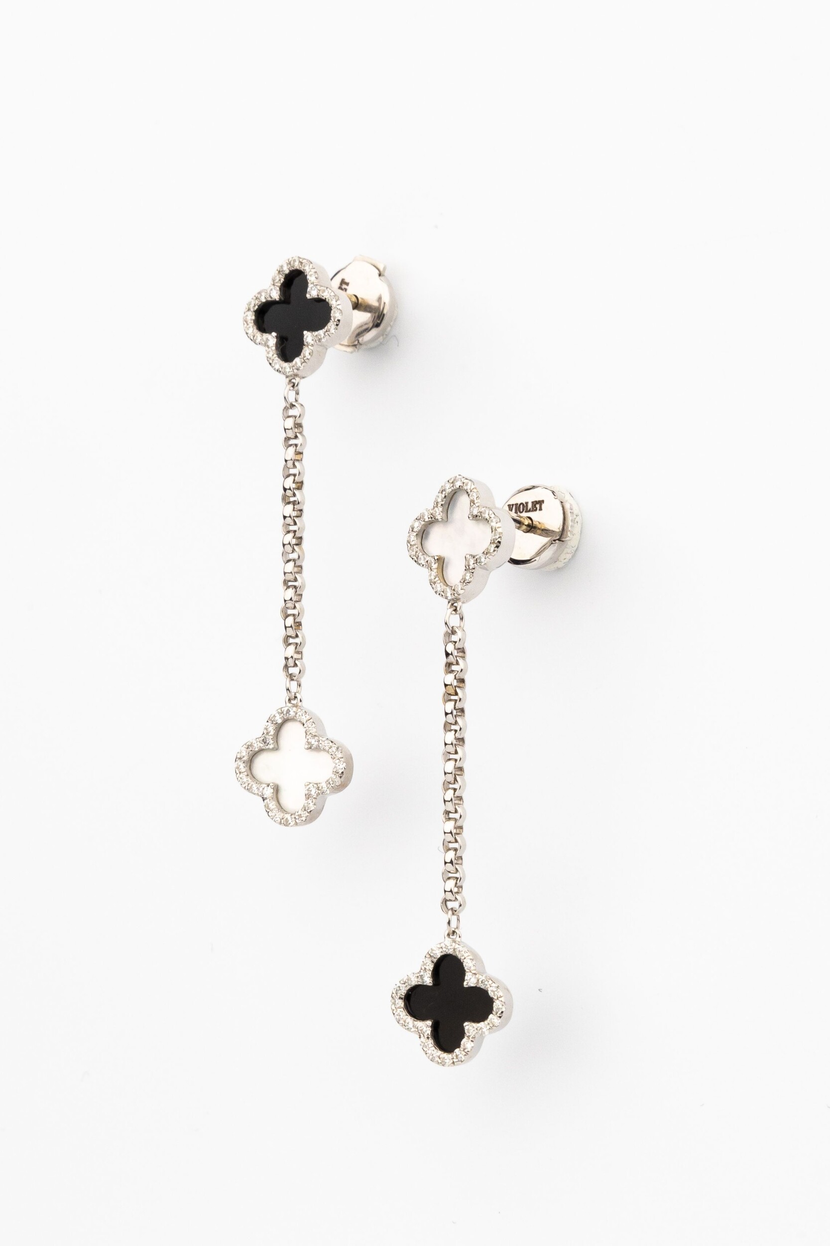 Центральными элементами композиции выступают вставки из черного оникса и светлого перламутра, которые эффектно перекликаются друг с другом, создавая гармоничный и глубокий образ. Изысканное мерцание дополняют 98 бриллиантов круглой огранки, которые обрамляют каждый лепесток клевера, создавая ореол роскошного сияния. Белое золото подчеркивает холодный блеск камней и чистоту оттенков вставок, делая аксессуар универсальным дополнением к любому образу.