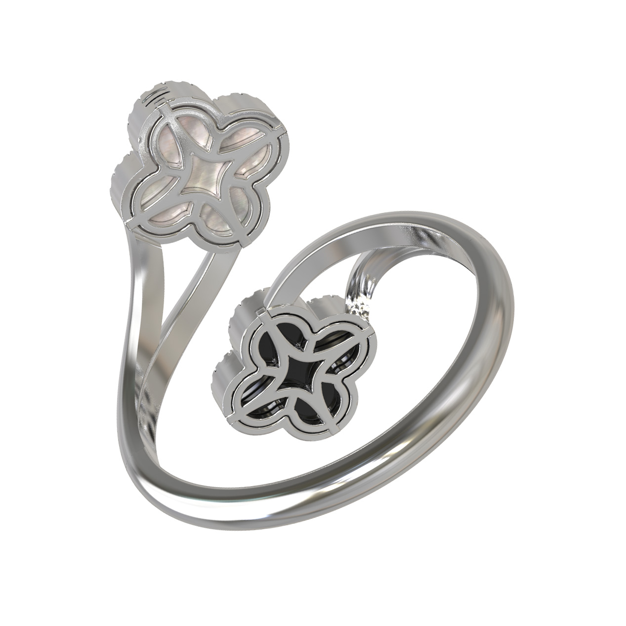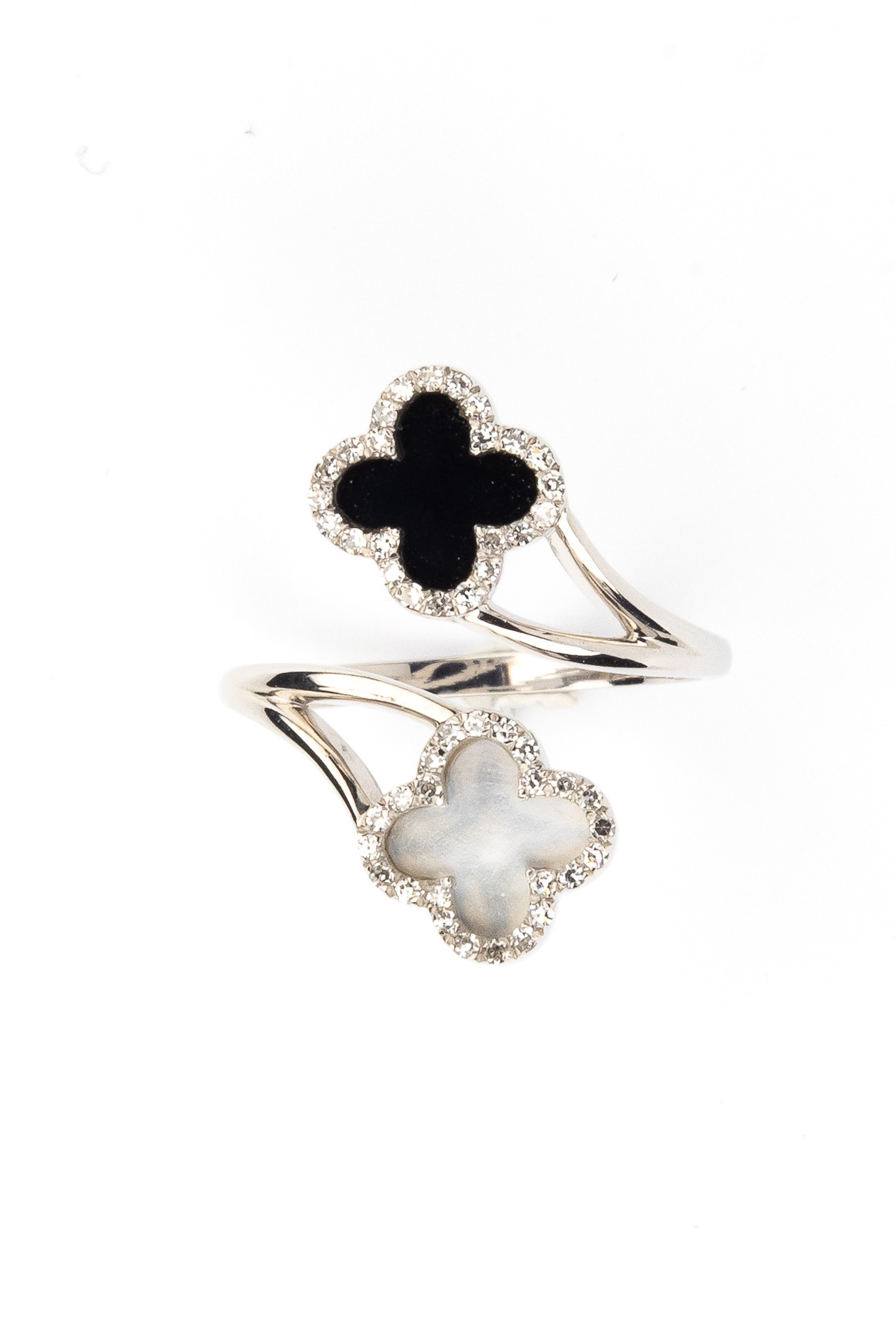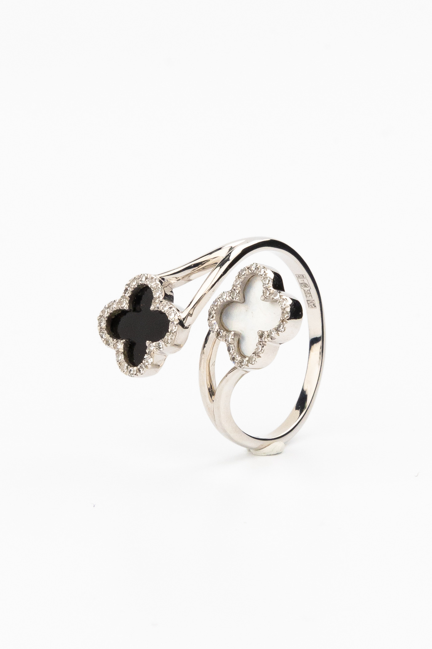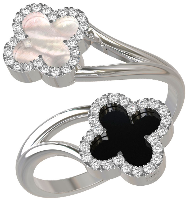 В центре композиции — эффектное сочетание контрастов: глубокий черный оникс и нежный перламутр создают выразительный дуэт. Очарование вставок подчеркивает сияние 49 бриллиантов круглой огранки, которые обрамляют каждый лепесток клевера, добавляя украшению роскошного блеска. Белый цвет металла идеально оттеняет игру света на гранях камней.