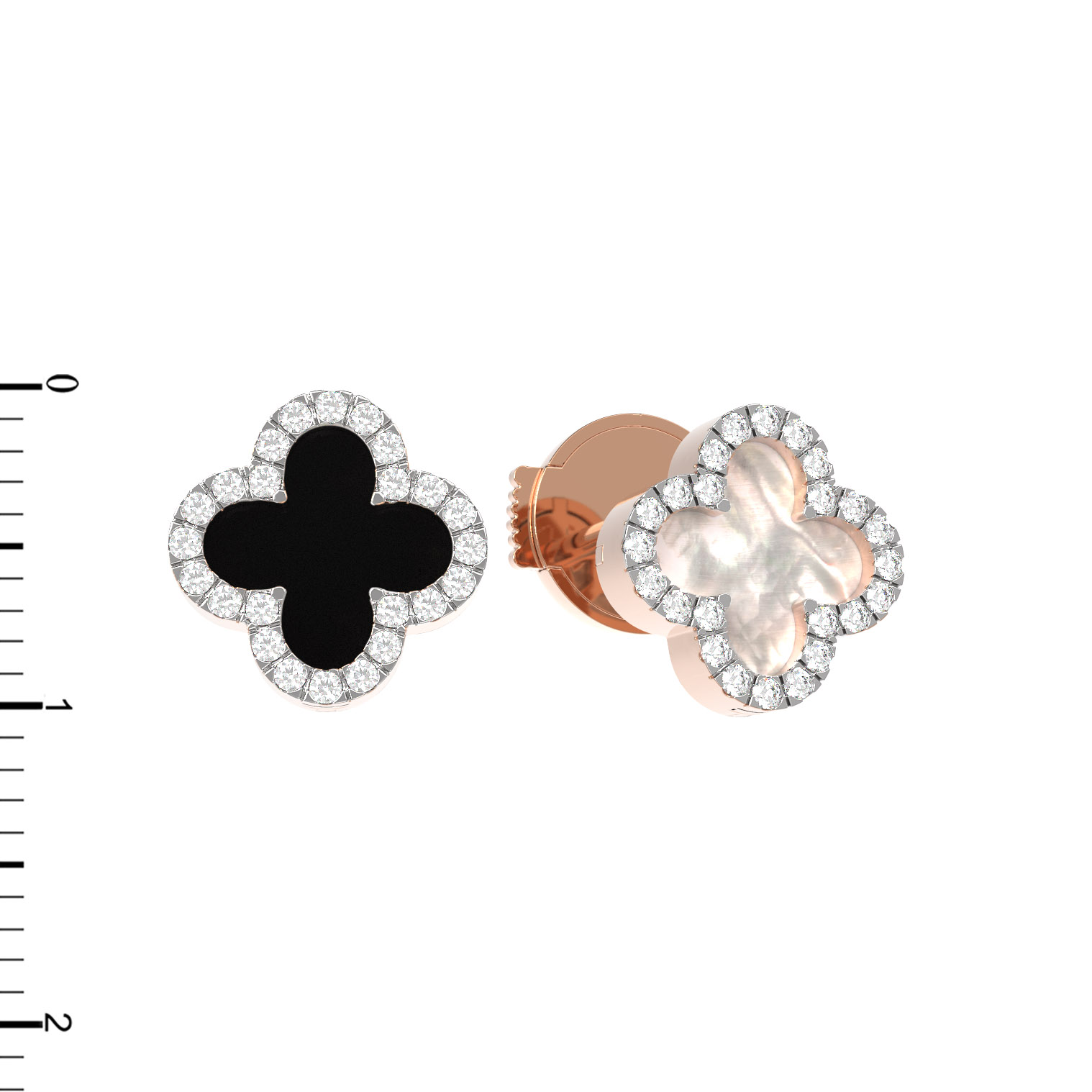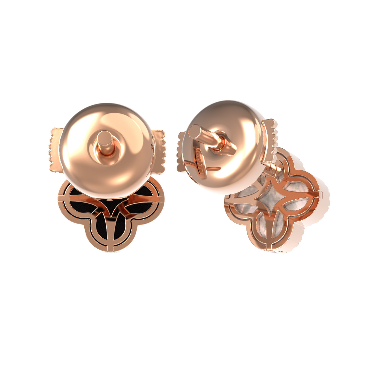 В центре композиции расположены изысканный оникс черного цвета и нежный перламутр, которые создают эффектную игру света и тени. Огранка вставок круглой формы позволяет максимально раскрыть глубину каждого камня. Роскошное сияние обеспечивает россыпь из 49 бриллиантов, обрамляющих контур клевера, придавая серьгам благородный блеск. Это изделие, представленное в коллекции De Luxe — Цветок клевера — Бриллианты, является универсальным украшением, которое подходит как для женщин, так и для мужчин, предпочитающих классику в современной интерпретации.