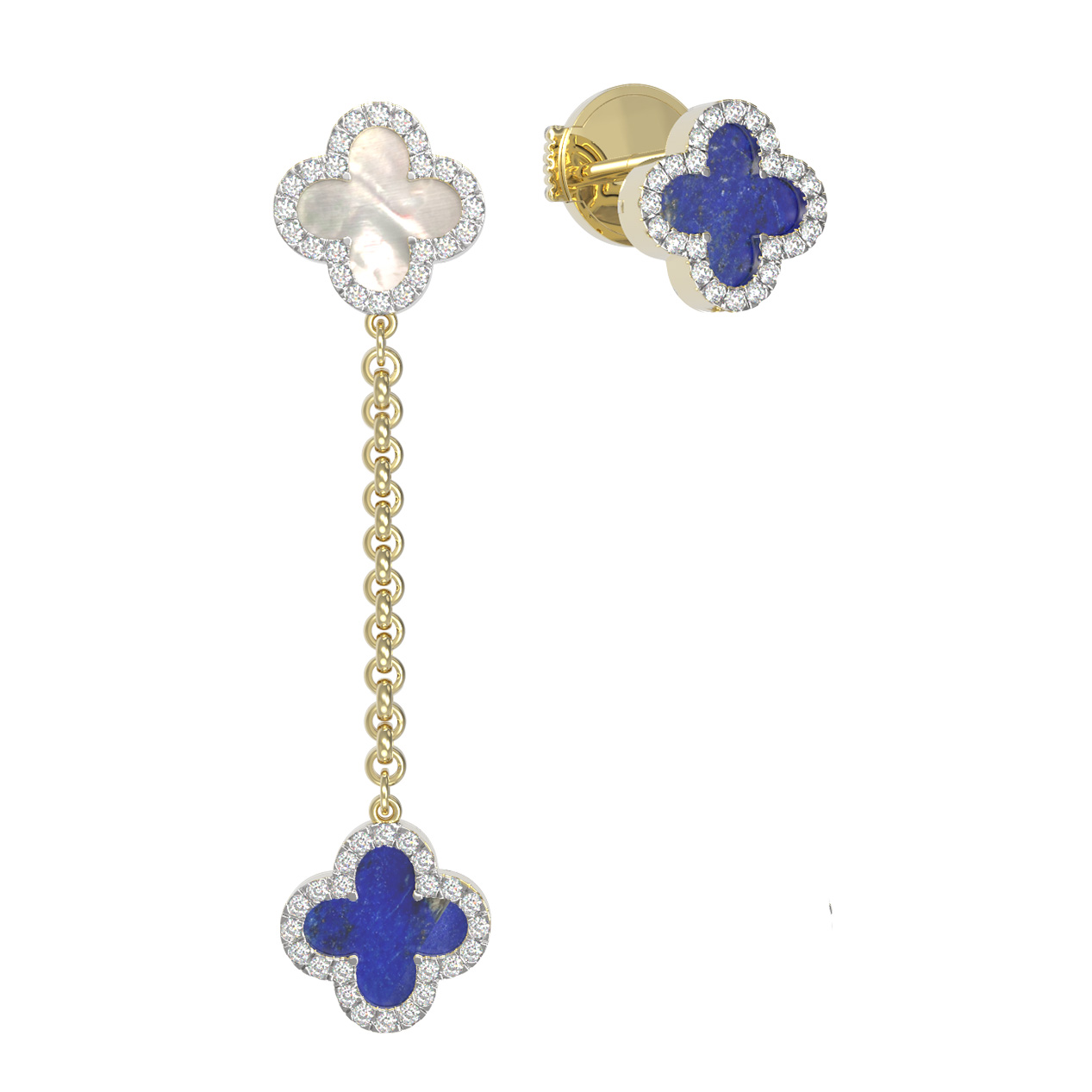 Эти серьги — универсальный аксессуар, созданный для женщин и мужчин, стремящихся к индивидуальности в своем образе. Тщательно проработанный дизайн позволяет использовать украшение как самостоятельно, так и в составе комплекта, дополняя другие изделия из линии De Luxe — Цветок клевера — Бриллианты. Безупречное сочетание синего лазурита, светлого перламутра и лимонного золота делает эти серьги идеальным выбором для ценителей эксклюзивных ювелирных изделий, которые способны подчеркнуть статус и безупречный вкус владельца.