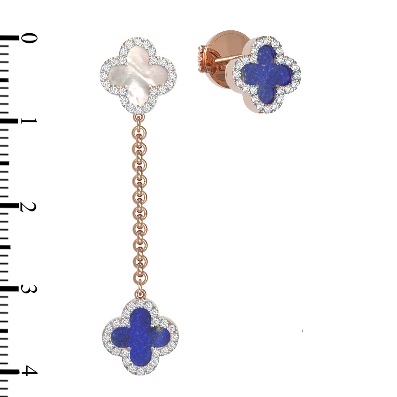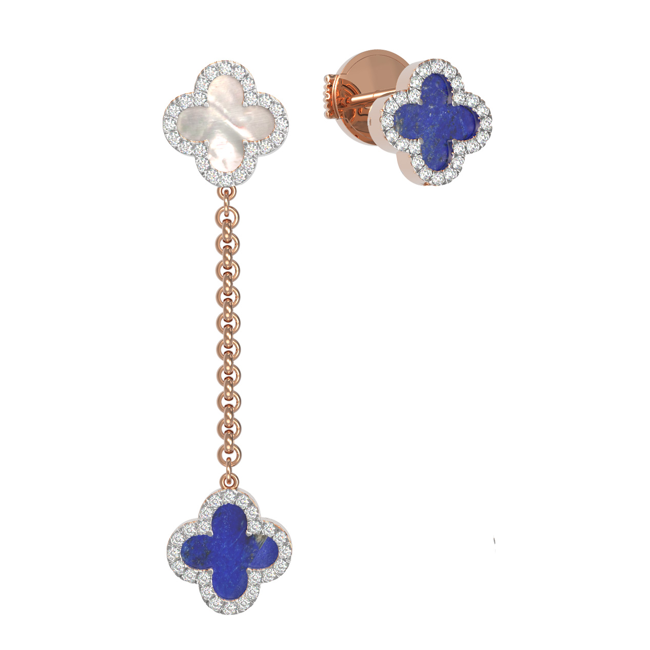 Особую выразительность изделию придает гармоничное сочетание материалов: благородного красного золота и контрастных вставок. Дизайнеры объединили классический блеск 74 круглых бриллиантов с глубоким, насыщенным синим цветом лазурита и нежным, переливающимся перламутром. Такая палитра делает серьги невероятно эффектными и запоминающимися. Благодаря выверенной геометрии и качественному исполнению, украшение комфортно располагается на мочке, создавая притягательный акцент.