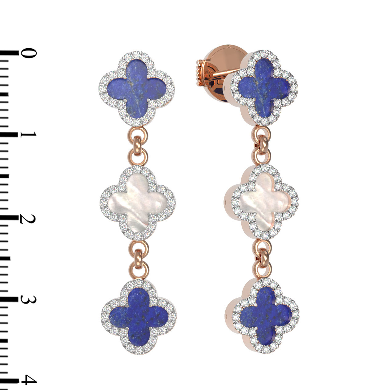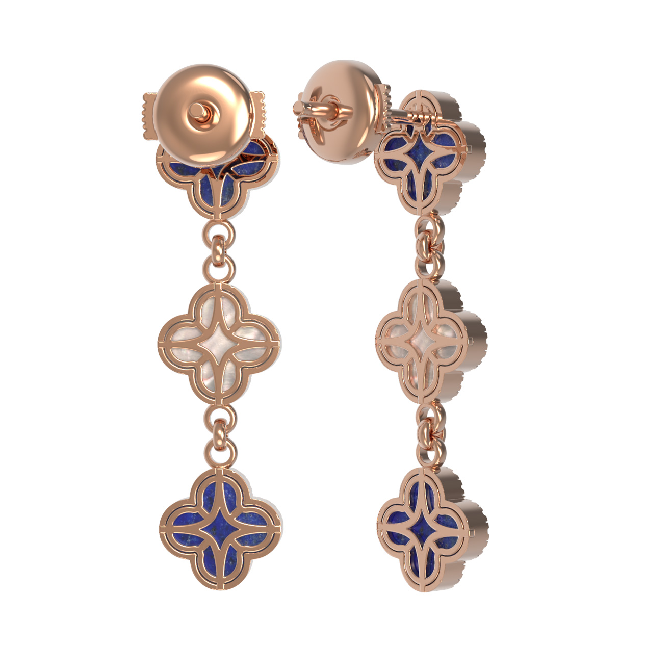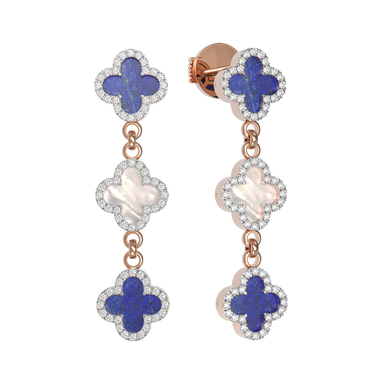 Изысканные серьги из красного золота 585 пробы — это воплощение элегантности и утонченного вкуса. Дизайн изделия, вдохновленный формой цветка клевера, делает это украшение настоящим символом удачи и стиля. Изящная композиция дополнена роскошным сочетанием материалов: в центре внимания находятся вставки из натурального синего лазурита и нежного перламутра, которые гармонично оттеняют теплое сияние драгоценного металла.
