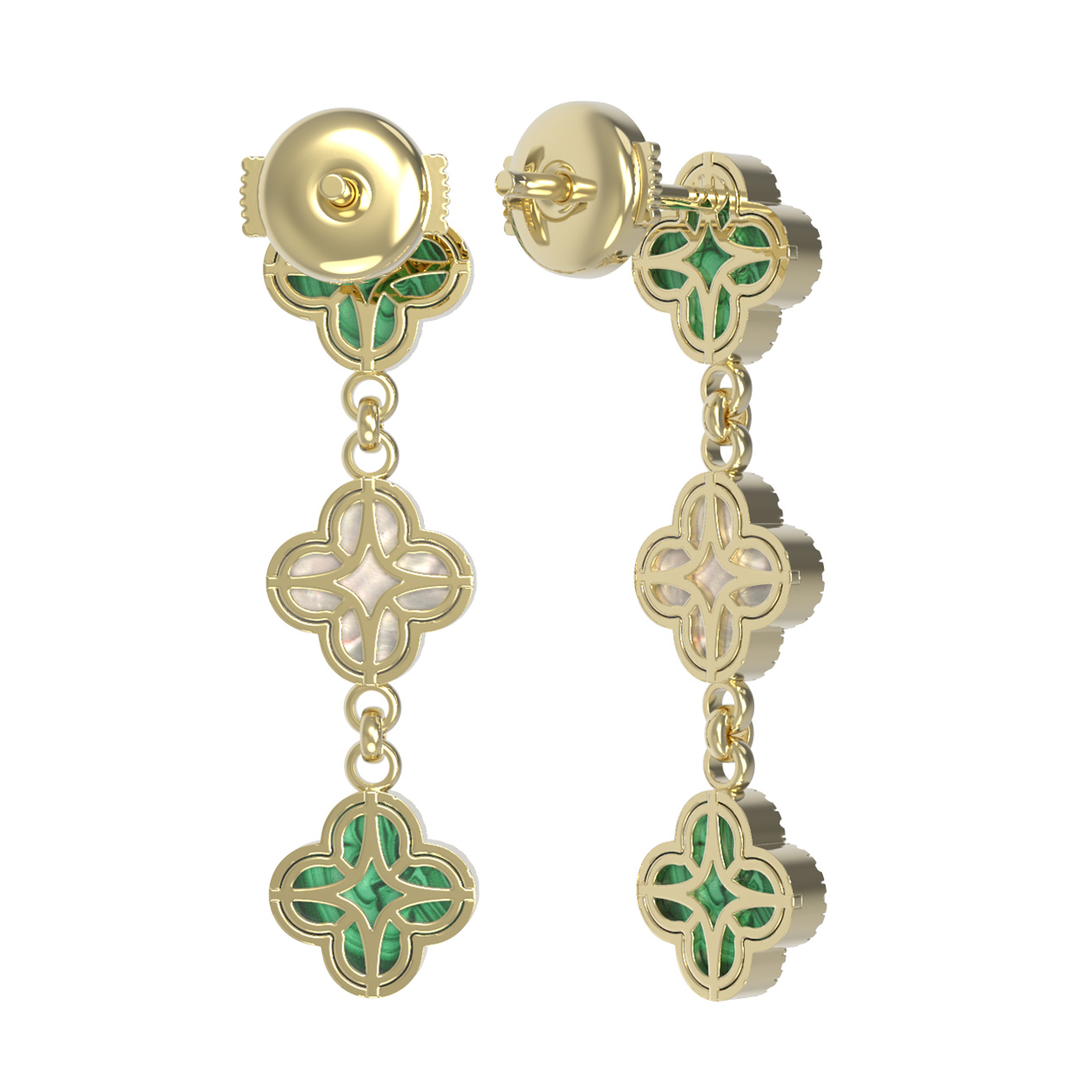 Композиция серег строится на чередовании драгоценных и полудрагоценных камней: насыщенный зеленый малахит здесь соседствует с нежным, переливающимся перламутром. Весь периметр каждой вставки окружен сияющей россыпью из 148 бриллиантов круглой формы, которые добавляют украшению благородного блеска. Контраст белого сияния бриллиантов, глубокого зеленого цвета вставок и мягкого перламутра делает эти серьги настоящим произведением искусства.