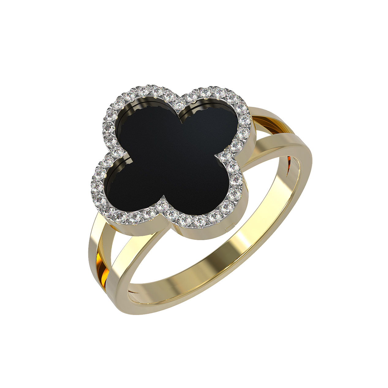Элегантное кольцо из лимонного золота 585 пробы из коллекции De Luxe — Цветок клевера — Бриллианты станет безупречным акцентом вашего образа. Дизайн украшения воплощает классическую эстетику в современном прочтении: центральным элементом выступает изящный цветок клевера, ставший символом удачи и благородства. Глубокий, насыщенный черный оникс в центре композиции эффектно контрастирует с драгоценным металлом, создавая притягательную игру фактур.