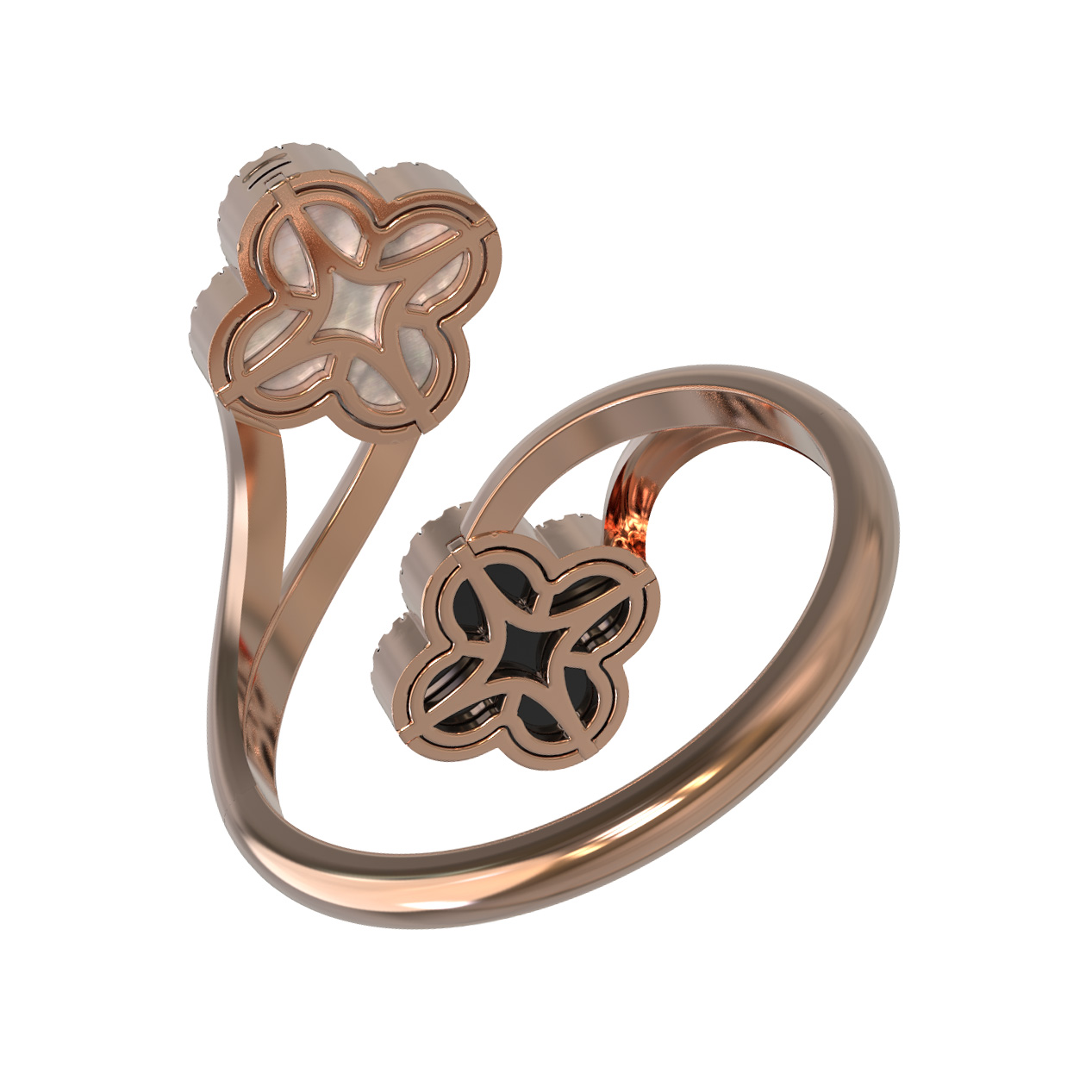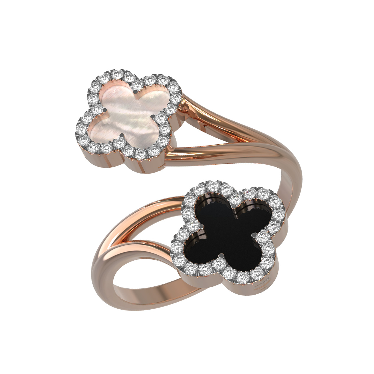 Кольцо из красного золота 585 пробы из коллекции De Luxe — Цветок клевера — Бриллианты воплощает в себе изысканность и утонченный вкус. Дизайн изделия, выполненный в форме двух цветков клевера, делает это украшение ярким акцентом любого образа. В центре композиции гармонично сочетаются вставки из черного оникса и нежного перламутра, которые придают кольцу глубину и выразительность. Общее количество вставок составляет 49, среди которых блистают круглые бриллианты, создающие эффектное сияние.