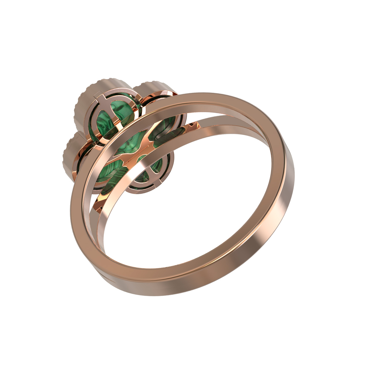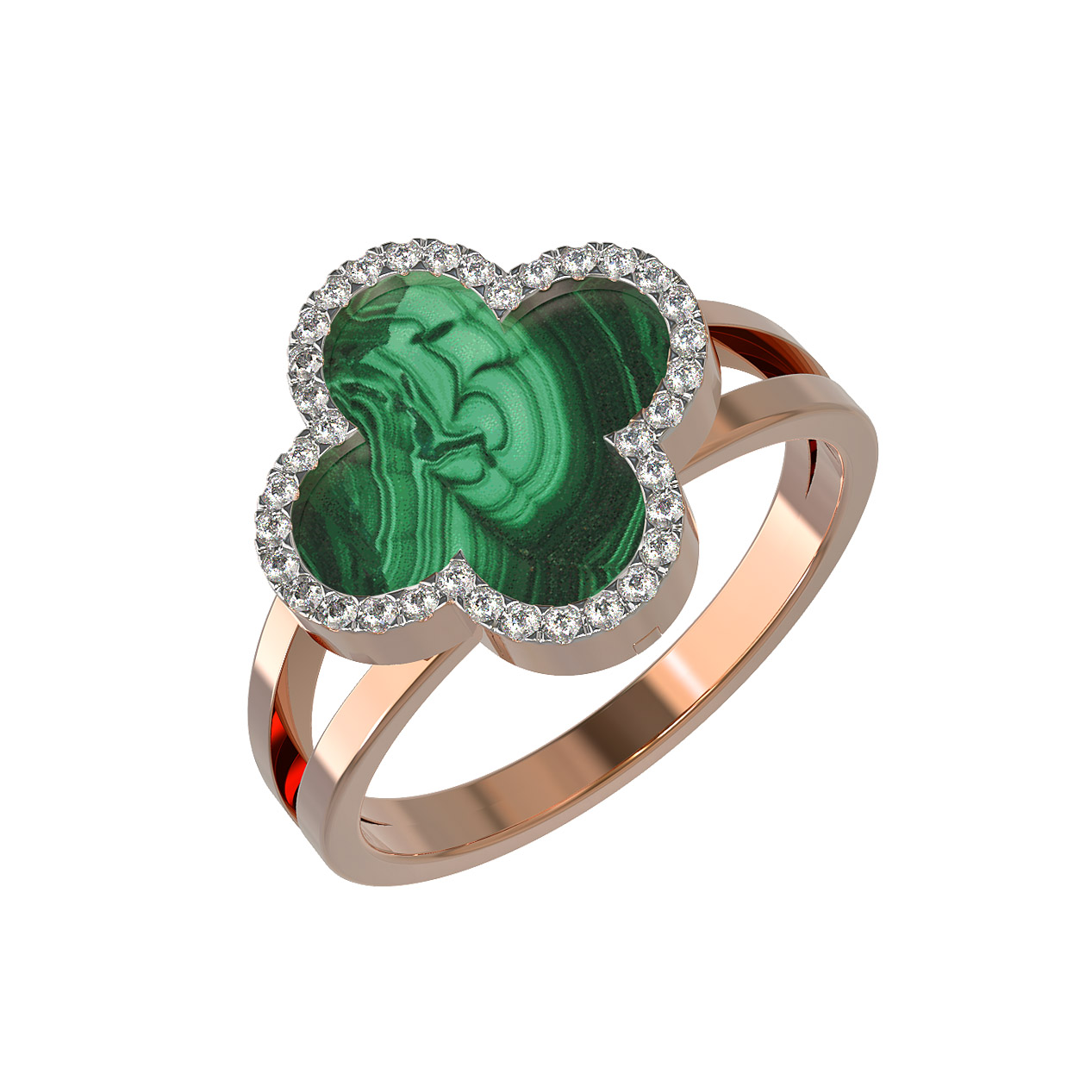 Изысканное кольцо из красного золота 585 пробы из коллекции De Luxe — Цветок клевера — Бриллианты воплощает в себе гармонию природной красоты и ювелирного мастерства. В центре композиции — выразительная вставка из натурального малахита глубокого зеленого цвета, чьи уникальные природные узоры создают неповторимый облик украшения. Эффектный дизайн в форме цветка клевера окружен сияющим ореолом из 37 бриллиантов, которые добавляют изделию благородного блеска и яркости.