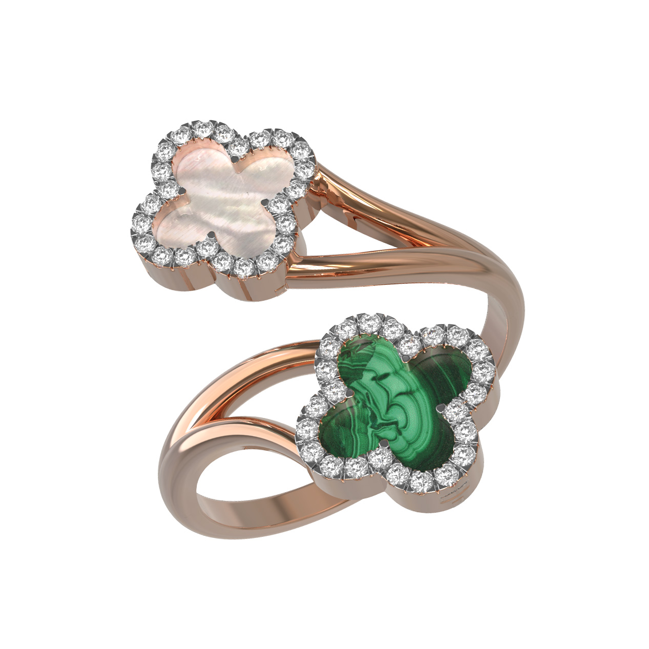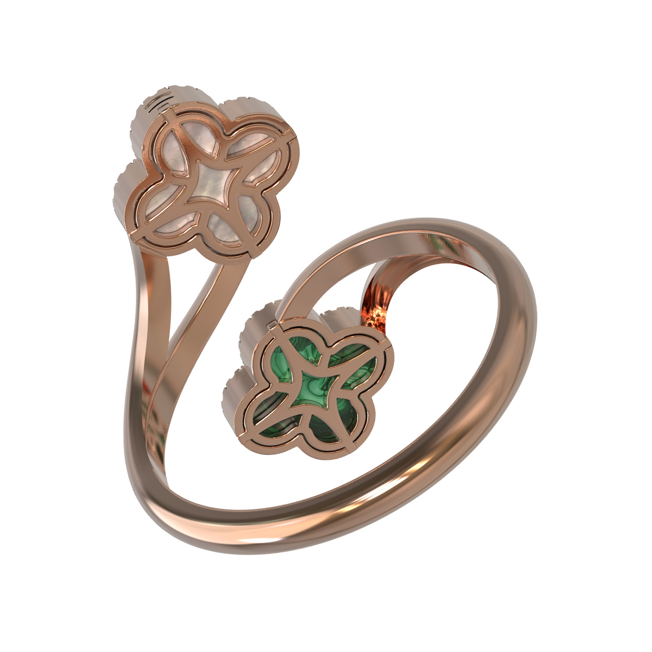 Элегантное кольцо из коллекции De Luxe — Цветок клевера — Бриллианты станет изысканным акцентом вашего образа, привлекая внимание гармоничным сочетанием драгоценных материалов и утонченного дизайна. Ювелирное изделие выполнено из красного золота 585 пробы, чей теплый блеск подчеркивает природную красоту вставок. Центральный элемент украшения — выразительный дизайн в форме клевера, символизирующий удачу и благополучие. Композиция дополнена контрастным дуэтом природного малахита зеленого цвета и нежного перламутра.