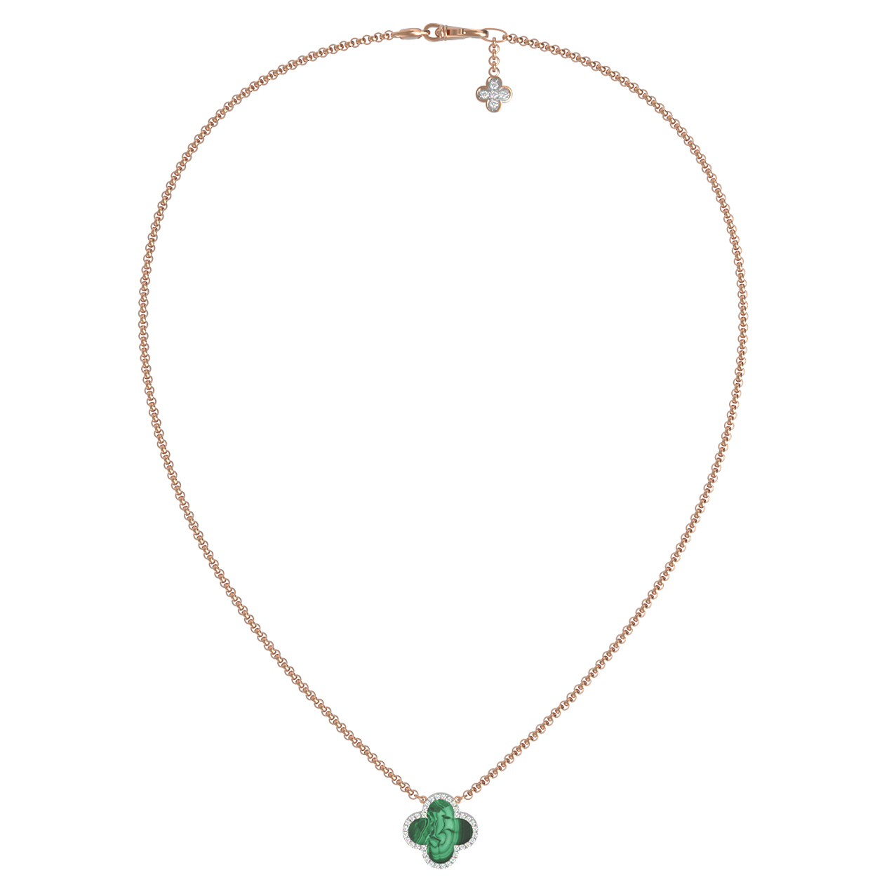 Изысканное колье из красного золота 585 пробы станет утонченным дополнением вашего образа. Это украшение из коллекции De Luxe — Цветок клевера — Бриллианты воплощает собой гармонию благородного металла и природной красоты камней. Центральный элемент изделия выполнен в узнаваемом дизайне клевер, который символизирует удачу и процветание. Насыщенный зеленый малахит круглой формы в центре композиции дополнен россыпью из 84 ослепительных бриллиантов, создающих великолепное сияние вокруг центральной вставки.