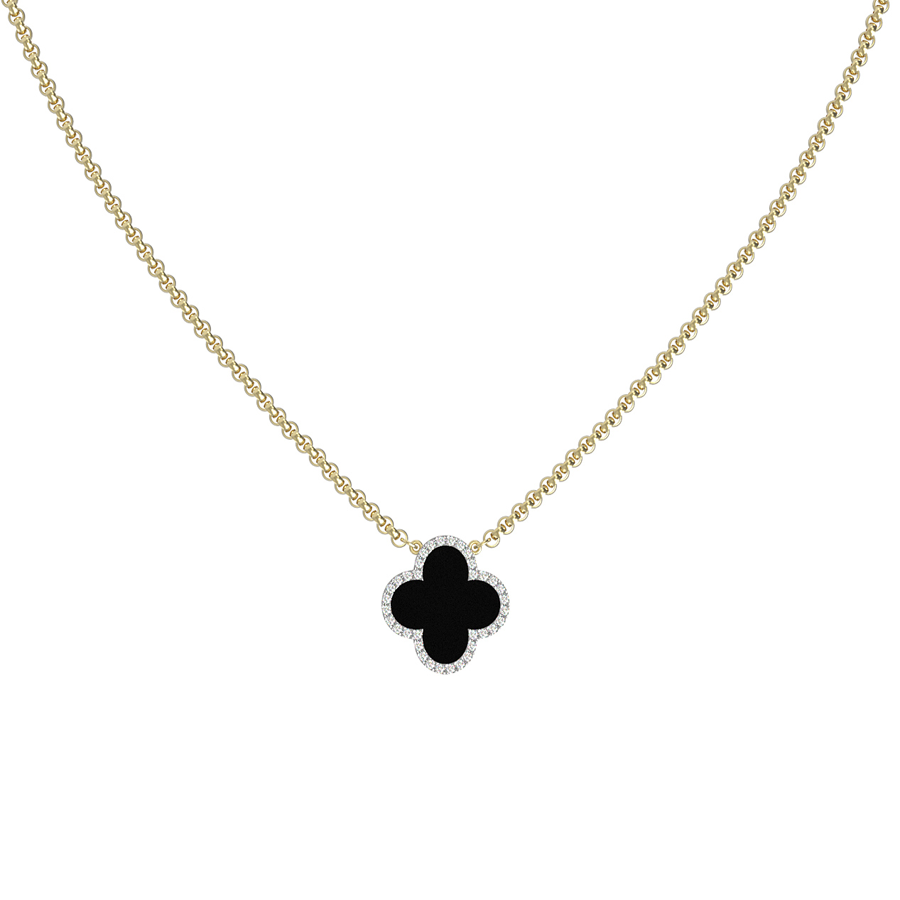 Изысканное колье из лимонного золота 585 пробы из коллекции De Luxe — Цветок клевера — Бриллианты станет безупречным акцентом вашего образа. Дизайн украшения выполнен в форме четырехлистного клевера, который неизменно ассоциируется с удачей и гармонией. Центральный элемент изделия инкрустирован глубоким черным ониксом, создающим эффектный контраст с благородным лимонным оттенком золота.