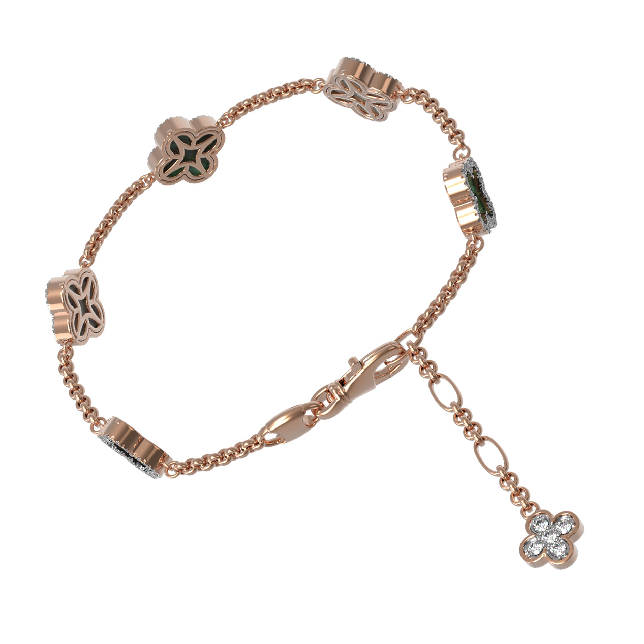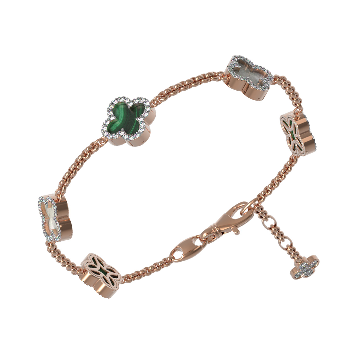 Этот браслет самодостаточен, однако прекрасно дополнит другие украшения, позволяя создавать завершенные комплекты. Выбирая данное изделие из коллекции De Luxe — Цветок клевера — Бриллианты, вы отдаете предпочтение качеству исполнения и благородным материалам. Изделие сочетает в себе теплоту красного золота с магией драгоценных и полудрагоценных камней, превращая привычный аксессуар в произведение ювелирного искусства.
