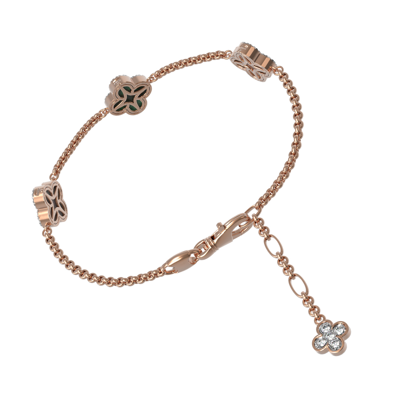 Элегантный браслет из коллекции De Luxe — Цветок клевера — Бриллианты — воплощение утонченности и высокого ювелирного искусства. Изделие выполнено из благородного красного золота 585 пробы, которое подчеркивает теплоту и изысканность дизайна. Основным акцентом украшения выступает узнаваемый мотив — цветок клевера. Эта гармоничная форма дополнена сочетанием природных минералов: насыщенного зелёного малахита и нежного перламутра, создающих выразительный контраст.