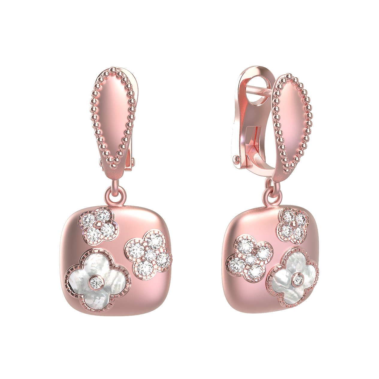 Изящные серьги из розового золота 585 пробы из коллекции De Luxe — Цветок Флоренции станут воплощением утонченного стиля и природной гармонии в вашем образе. Дизайн изделия вдохновлен нежными флористическими мотивами, где центральным элементом выступают изящные цветы. Ювелиры с мастерством подобрали сочетание материалов: мягкое сияние розового металла подчеркивается благородным перламутром белого цвета и искристыми бриллиантами. Форма вставок в виде четырехлистника и круга создает динамичную и притягательную композицию, которая притягивает взгляд.