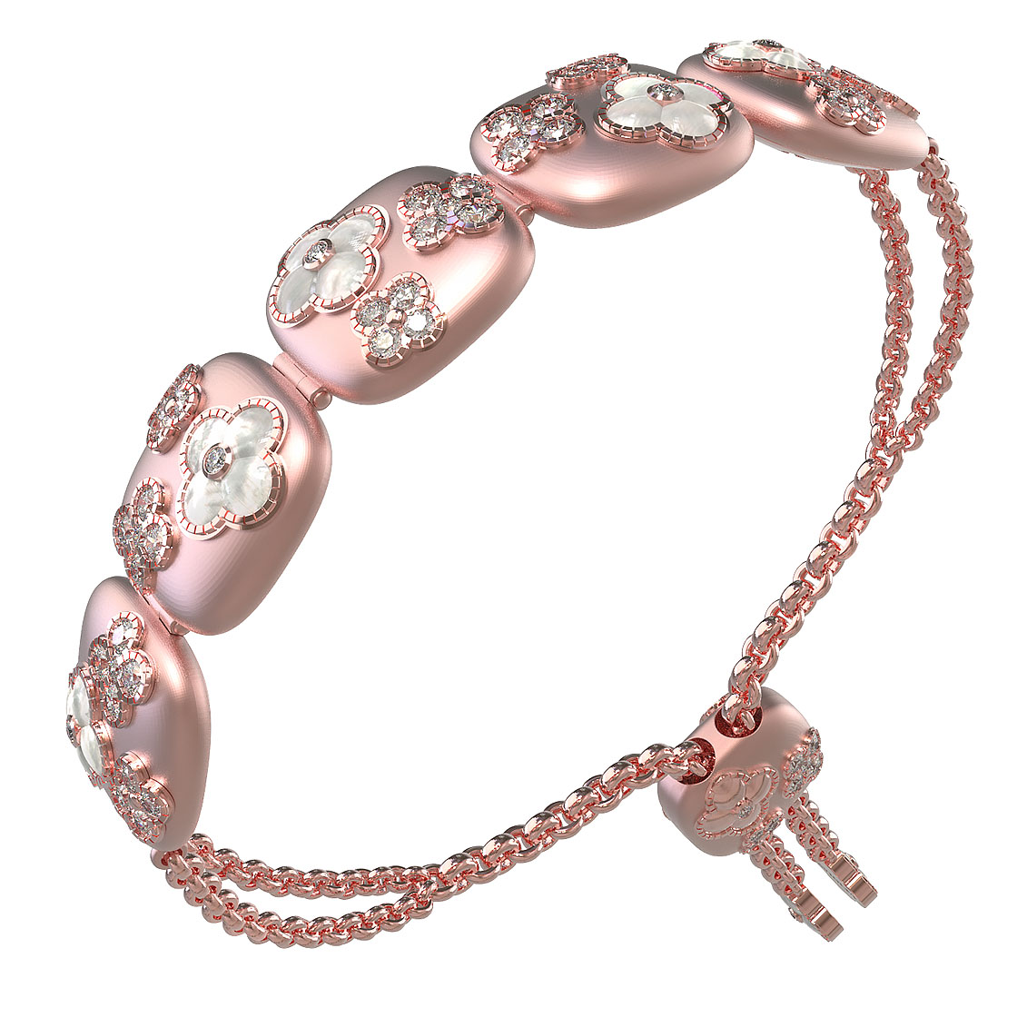 Центральным элементом композиции стали вставки в форме четырёхлистников, украшенные сияющим перламутром белого цвета. Нежное мерцание перламутра гармонично дополняется россыпью из 72 бриллиантов круглой огранки, которые привносят в изделие роскошный блеск и динамику. Тщательно продуманный дизайн, сочетающий классические формы и современные ювелирные техники, делает этот браслет универсальным аксессуаром.