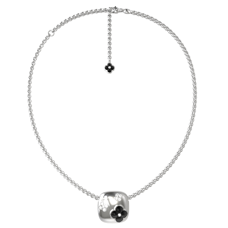В ювелирном изделии гармонично переплетаются две формы вставок: строгая геометрия круга и изящный четырехлистник. Всего колье насчитывает 13 вставок, каждая из которых закреплена с безупречным вниманием к деталям. Универсальный дизайн делает это украшение подходящим как для женщин, так и для мужчин, позволяя создавать неповторимые образы — от повседневных до вечерних. Такое колье может стать центральным акцентом вашего ювелирного гардероба или прекрасным дополнением к другим украшениям, так как модель отлично сочетается с аналогичными аксессуарами, входящими в комплекты.