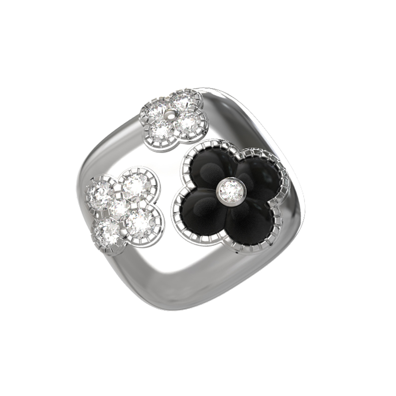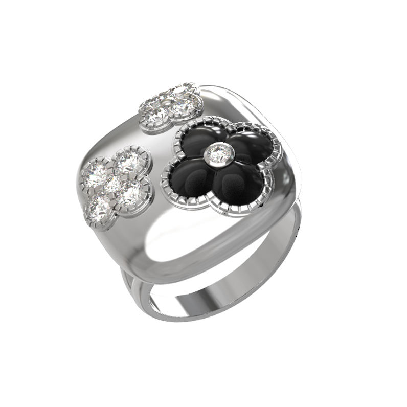 Элегантное кольцо из белого золота 585 пробы из коллекции De Luxe — Цветок Флоренции станет безупречным акцентом вашего образа. Дизайн украшения вдохновлен флористическими мотивами, где центральным элементом выступает изящный четырехлистник. Контрастное сочетание материалов подчеркивает благородство изделия: насыщенный черный оникс гармонично дополнен сиянием 11 вставок, среди которых сверкающие бриллианты круглой огранки.