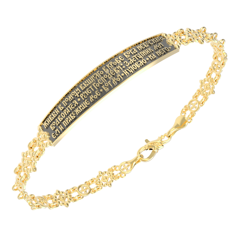 На основном звене браслета написана молитва: «Живый в помощи Вышняго, в крове Бога Небеснаго водворится. Речет Господеви: Заступник мой еси и Прибежище мое, Бог мой, и уповаю на Него.»