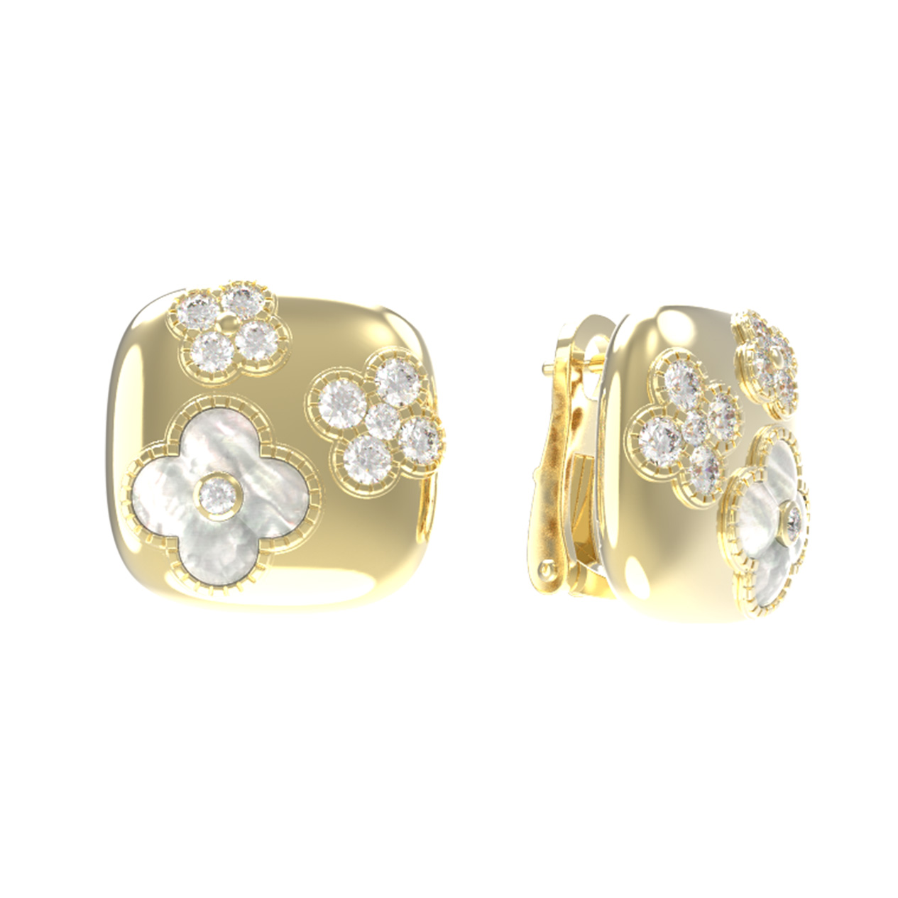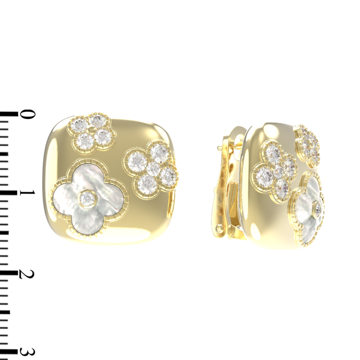 Серьги входят в коллекцию De Luxe — Цветок Флоренции, отличающуюся особой эстетикой и качеством исполнения. Вставка из перламутра в форме четырехлистника придает украшению мягкое, переливающееся сияние, в то время как 20 бриллиантов круглой формы подчеркивают роскошь лимонного золота. Белый цвет вставок гармонично контрастирует с теплым оттенком драгоценного металла, создавая цельный и выразительный образ.