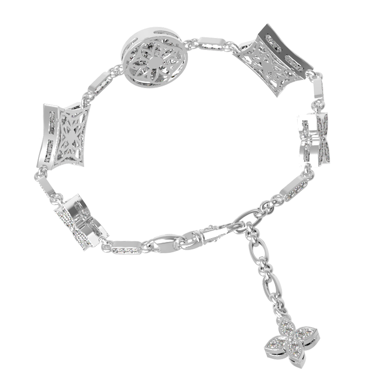 Центральным элементом композиции выступают 154 бриллианта круглой формы с белым цветом вставок. Тщательно отобранные камни создают эффектное мерцание, которое приковывает восхищенные взгляды. Продуманная конструкция браслета позволяет ему комфортно располагаться на запястье, обеспечивая удобство при повседневном ношении.