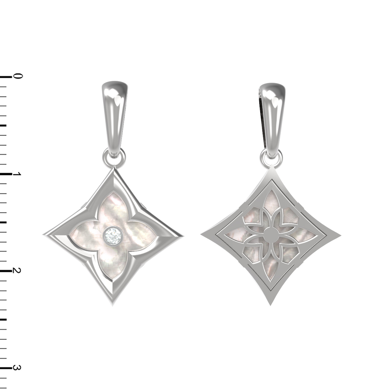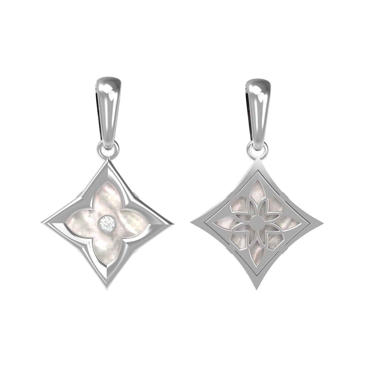 В центре композиции расположен сверкающий бриллиант круглой формы, который акцентирует внимание на глубине и чистоте инкрустации. Контрастный блеск драгоценного камня подчеркивается вставкой из нежного перламутра, имеющего правильную ромбовидную форму. Белый цвет вставок гармонично сочетается с холодным оттенком белого золота, создавая сбалансированный и притягательный визуальный эффект. Использование качественных материалов обеспечивает изделию долговечность и безупречный внешний вид при повседневном ношении.